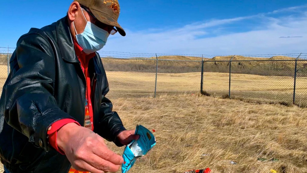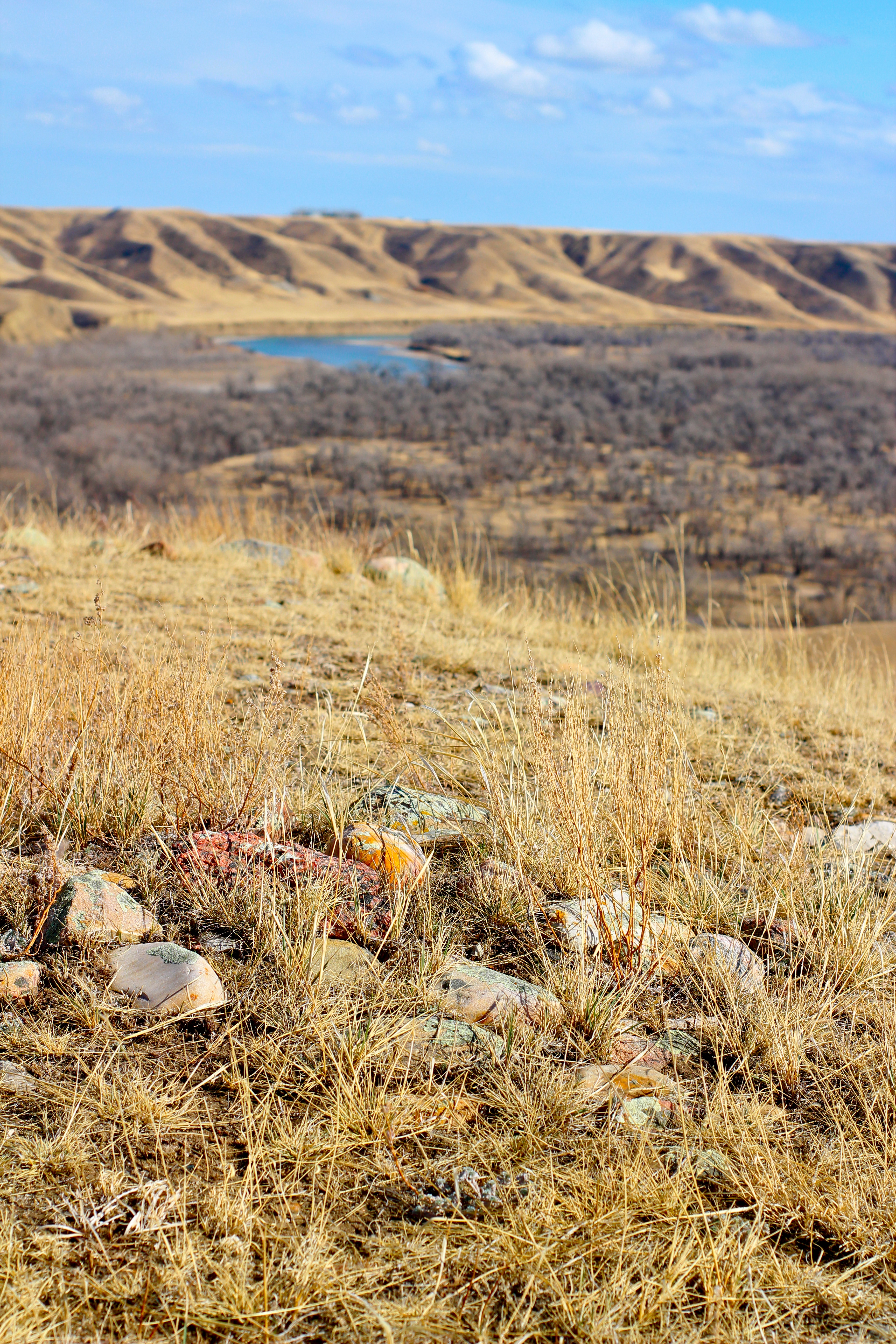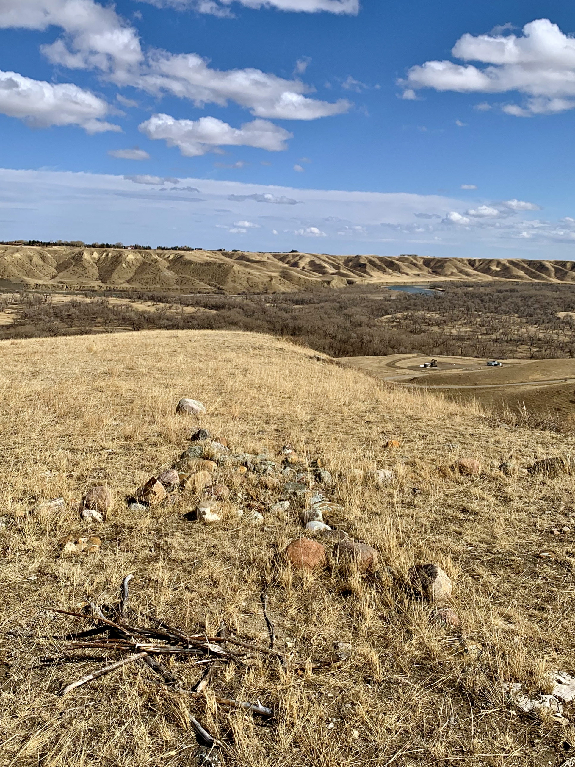 A safe and sheltered location, like Weasel Fat Bottom, would be ideal to begin and end the seasonal round. The long-time use and significance of this place is evident through the medicine wheels, effigies and tipi rings that dot the landscape. Today, we visit Nitapinaw/Nita-pinn-awa (Real Chief medicine wheel) and Aka-kitsipimi-ota (Many Spotted Horses medicine wheel). Both medicine wheels served as landmarks and memorials to past leaders and warriors. We leave tobacco at Aka-kitsipimi-ota, to honour the ancestors and to ask for protection during our site visit and travels. In the video below, Blair explains how this landscape was used, and how ceremony renews Niitsitapi commitments to the land each year.