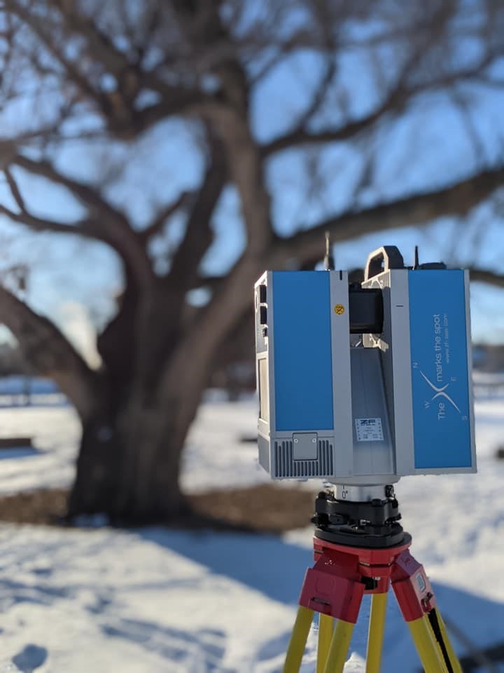 Digital documentation of the Stampede Elm was completed by Dr. Peter Dawson’s digital heritage research group from the Department of Anthropology and Archaeology, University of Calgary with the City of Calgary. Documentation took place on January 7, 2021 and was done with a Z+F 5010X terrestrial laser. Terrestrial laser scanning (TLS) is a form of ground-based LiDAR used to capture phenomena in 3D. Used widely in other fields, TLS is finding many applications in the field of heritage and archaeology to document built heritage structures, archaeological excavations and individual objects. The Capture2Preserv project has used this technology to document a variety of heritage sites throughout Alberta.