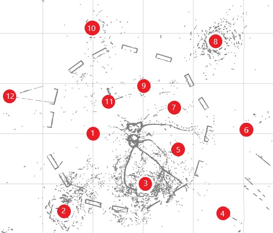 To capture the entirety of an object, several scanning locations are positioned around it. For the Stampede Elm, 12 scanning locations were placed in a staggered circular shape around the tree. Placing the scanner not only around the tree but at nearer and further intervals allowed for the most inclusive capture of the complicated geometry of branches.