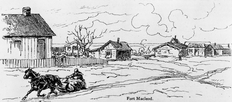 The picture returns to focus in the 1870s, first with the accounts of American whiskey traders and later the Northwest Mounted Police (NWMP). Whiskey trader John LaMott recounts travelling with three Canadian Métis through the Belly River valley during the early 1870s, while NWMP surgeon, Richard Barrington Nevitt notes the presence of a Métis settlement on the Belly River prior to the arrival of the Mounties in 1874. Nevitt’s writings and artwork merit particular attention; according to Hugh Dempsey, “[Nevitt’s] letters of 1874-1878 are the most detailed account of life at Fort MacLeod known to exist.”