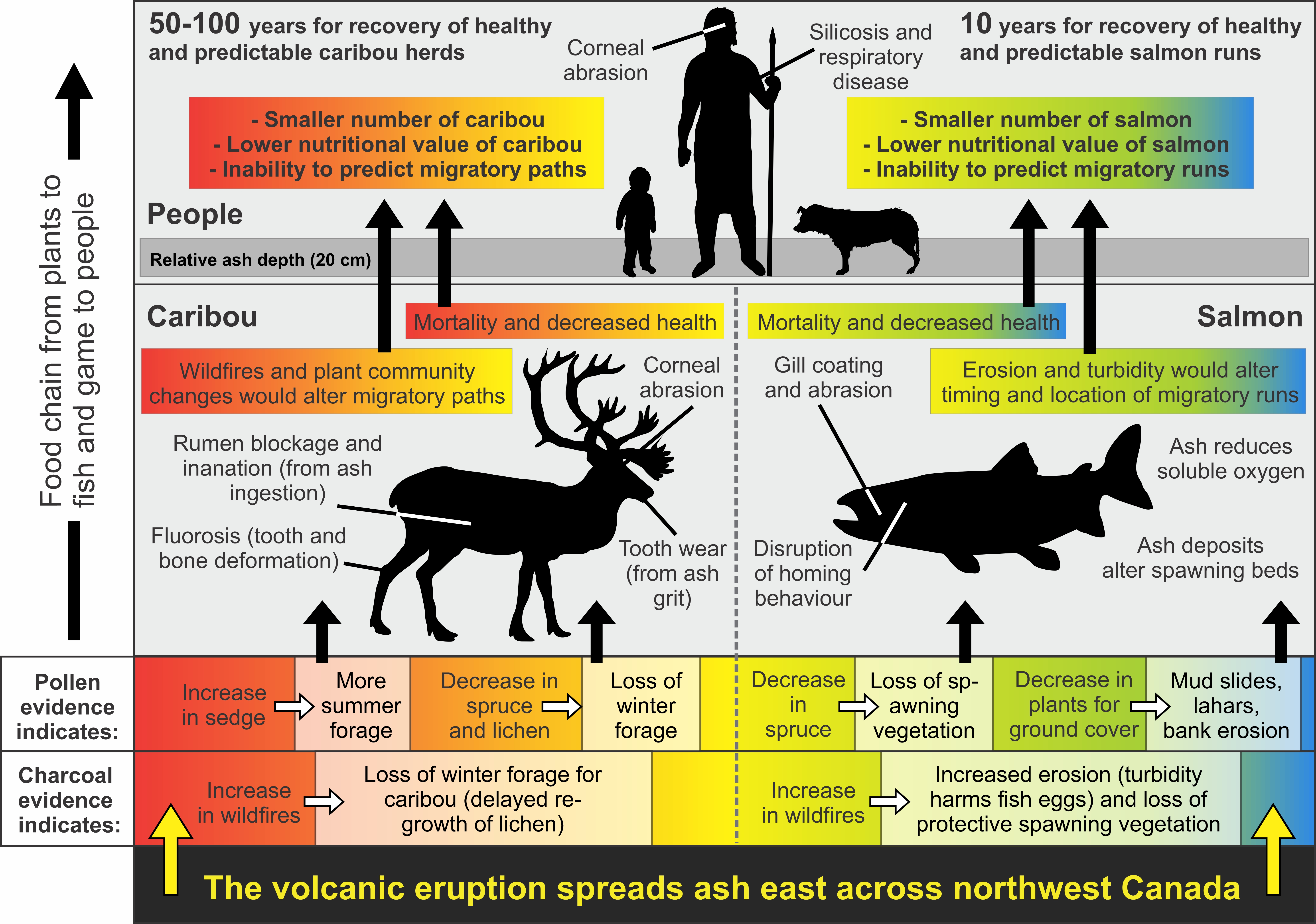 Livelihoods in Yukon and Northwest Territories were probably affected the most by impacts of volcanic ash on caribou and fish. Ash would’ve smothered low-lying plants that caribou relied on. Northern plant communities (including reindeer lichen) can take many decades to re-grow after disturbance. The ash, which is made of tiny glass particles, also would’ve caused eye problems, blocked digestive tracts, and led to animal tooth wear that resulted in malnutrition or death. Volcanic ash in water systems reduces oxygen available to fish, scratches their gills, smothers spawning beds and disrupts the ability of fish to relocate ancestral spawning grounds. Taken together, it took an estimated 50-100 years for caribou herds to become predictable food sources again, while fish likely took as little as a decade to return to healthy levels within the White River Ash East footprint.