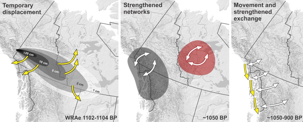 Archaeologists compare records before and after ancient volcanic eruptions to understand how the lives of people changed. Impacts of ecological disasters on humans can be detected along local and broad scales: how did Indigenous people cope at a specific site and how did human relationships change across vast regions? A massive eruption 1,200 years ago, called White River Ash East, changed the way that people in northern Canada hunted and gathered in areas affected by volcanic ash, which fell in beds up to 1 m thick. Beyond the ash footprint, human networks were forever altered, with ripple effects that spread through Alberta and North America.