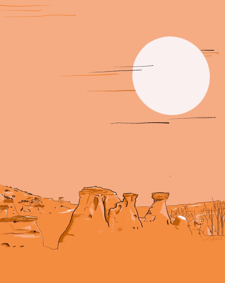 Oral histories of the Kainai (a tribe of the Niitsítapi or Blackfoot people) tell of a shrouded place called Áísínai’pi (meaning ‘it is being written’) that was visited but never lived in. Here, people heard the whistling voices of dead ancestors at spirit camps: the ghostly remnants of parties killed in battle. The rock spires, called matapiiksi by the Blackfoot (meaning ‘the people’), funnel sound while playing with sunlight and shadows that snake across their curves. Kainai call the hoodoos ‘medicine rocks’ because their human and animal shapes house spirits. And the mounds of clay that dot the valley are called spirit lodges: the ancestral tipis of cultural heroes that figure in Niitsítapi legends.