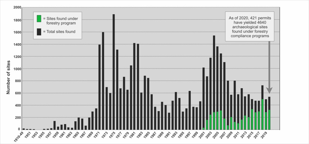 Forestry compliance with the Historical Resources Act began in 2000, with widespread adoption of archaeology programs by 2003. Currently there are about 20 operators who apply for archaeology permits each year and about 8 per cent of the incoming harvest blocks and logging roads are subjected to archaeological fieldwork (an historic resources impact assessment or HRIA). From 2000 to 2020, archaeological consultants have recorded 4,640 new sites in proposed harvest blocks and along proposed forestry roads. That’s roughly 11 per cent of the total recorded sites in Alberta (~42,000).