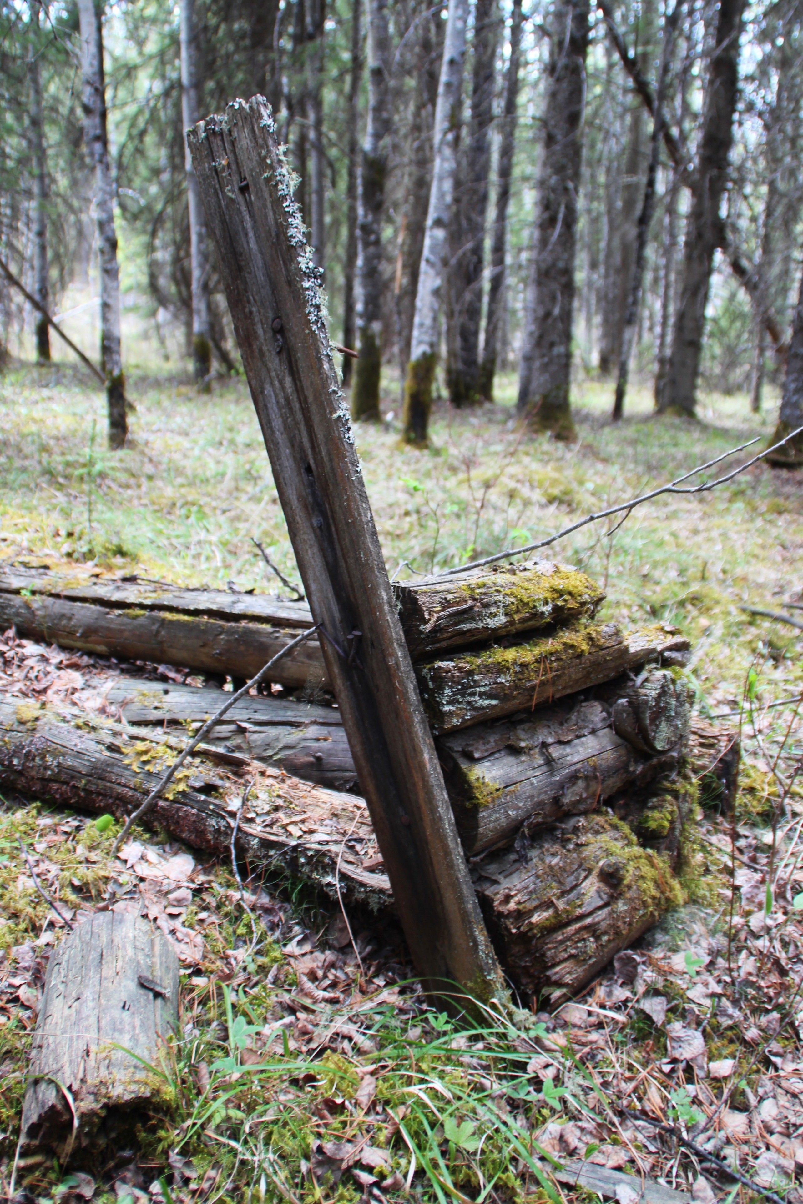 In 1995, an archaeological investigation located the remains of all five cabins. Today, nearly thirty years later, we can only find two, plus the remains of the chicken coop. When the Fleurys lived here, a communal barn was also built, located close to the riverbank. Between Charlotte’s cabin to the west and Louise’s cabin to the east is a large area that appears to have been cleared in the past. Today, the area has been repopulated with trembling aspen and balsam poplar, but it is relatively free of deadfall and underbrush. Historic photographs provided by the family in 1995 show the Fleury family clearing the land with hand axes. On this site visit, the Elders identify the area as likely grazing pasture for the livestock kept by the families: goats, teams of horses, chickens and at least one cow. Gladys remembers that Grandma Fleury always had milk available.