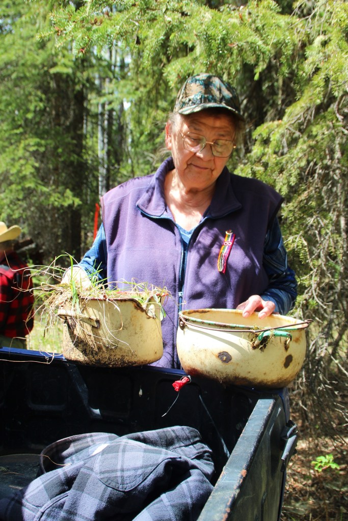 We sit down on the soft ground. Gladys motions to the moss surrounding us, noting how it was used by women as menstrual products and to line the moss bags that held babies safe and snug. Wild berries, Labrador tea, mint and medicinal plants are also found here: a reminder that this landscape, almost one hundred years ago, sustained an extended family of Métis matriarchs for more than a decade.