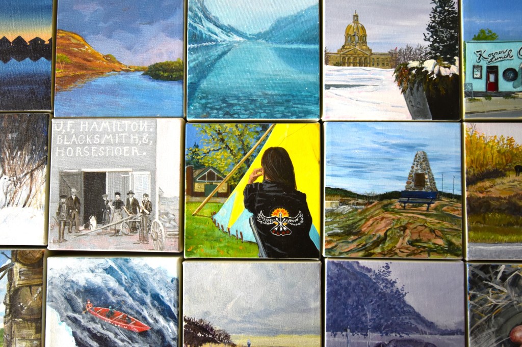 For five years, Sabine Lecorre-Moore has been traveling all over Alberta to museums, archives and community collections to find photographs featuring the experiences of Albertans. These images mainly depict the outdoors and feature her own interpretation of photographs from the 1800s to the present. While Lecorre-Moore works with several mediums, acrylic paint is Sabine’s tool for her latest project Painting Alberta. The 6”x 6” canvases are intended to be arranged and re-arranged into various patterns based on the exhibit space.