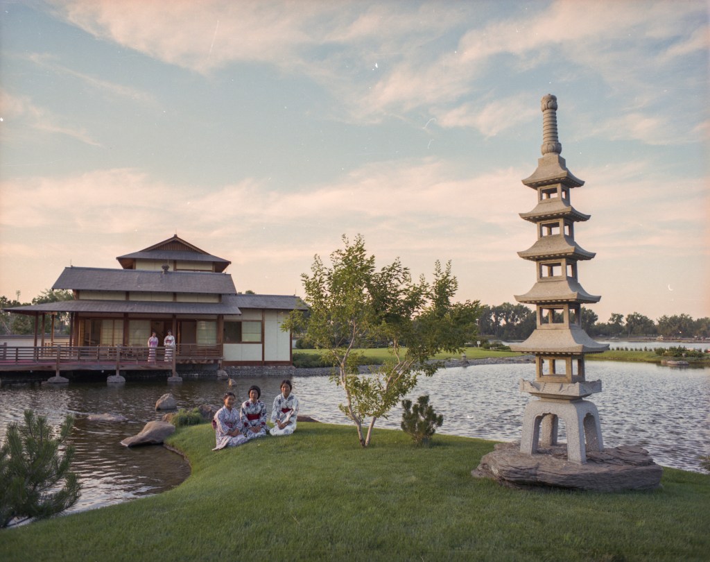 This need for story telling and knowing her subjects is what has brought the artist on the journey to various archives and museums across Alberta. At the Provincial Archives of Alberta (PAA), she found an image of the Japanese Garden in Lethbridge (July 1974), which led her to create the beautiful art piece pictured below. After coming to visit the PAA with a few of her pieces, Sabine met with archivist Kate Lazure and found numerous other photographs in the extensive PAA collection to add to her ever-growing exhibit which tells Alberta stories, past and present.