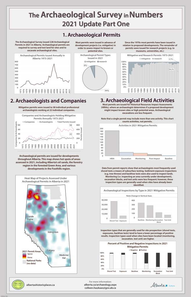 This week’s post is an update on the permit management system from 2021 from Alberta’s Archaeological Survey. Archaeological research in Alberta in Alberta that involves surveying and testing land or excavating archaeological sites must be conducted under an Archaeological Research Permit. Permits must be held by an archaeologist who meets professional qualifications. The infographic notes that 58 professional archaeologists held permits in Alberta in 2021; however many other archaeologists work in Alberta archaeology in addition to permit holders, such as field and laboratory technicians.