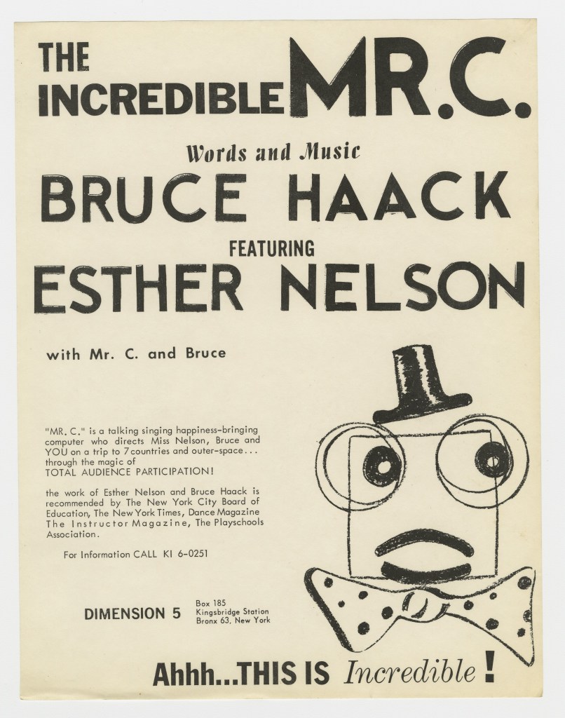 The records include all of Haack’s recordings on reel-to-reel tape, photographs, sheet music, notebooks, correspondence and business records. It was a near-complete record of Bruce Haack’s life and career and has since been fully catalogued, described, processed, rehoused into acid-free folders and boxes and preserved in the climate-controlled vaults at the Provincial Archives of Alberta. To arrange a viewing, contact the Collections Management Section of the PAA.