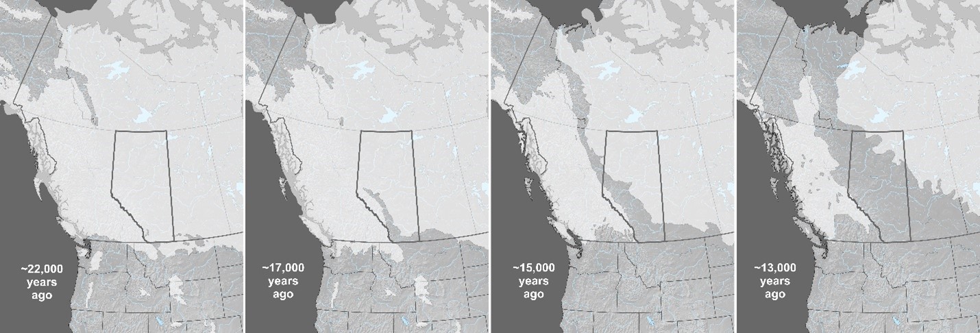 Alberta was once covered with glacial ice. Around 22,000 years ago, portions of the ice that sprawled across the province were over 1.5 kms thick. When the ice began to melt, it retreated in two directions (northeast and west) and exposed a pathway dubbed the Ice-Free Corridor that crossed through Alberta and connected previously exposed land masses over the warmer United States and a colder but drier region to the north called Beringia (parts of Northwest Territories, Yukon, Alaska, and Russia). People had settled into the corridor in what is now Alberta by 13,000 years ago. Where did they come from?