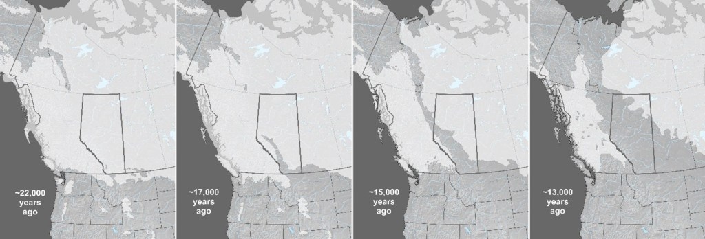 The melting of ice sheets over Alberta from roughly 22,000 to 13,000 years ago (based on data from Dalton et al. 2020). The ages are ‘calibrated’ from radiocarbon dates.