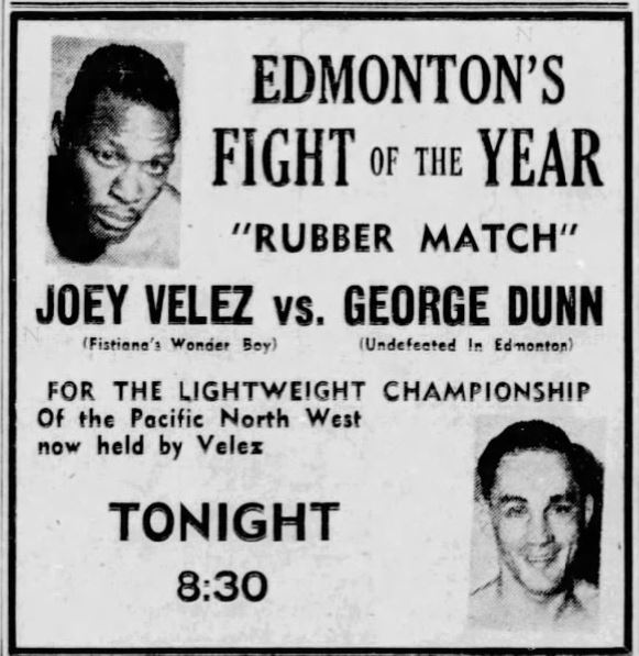 The earliest newspaper reference to his boxing career in Canada is July 1950, when he came from New York to headline a fight at the Kingsway Fastball Park in Edmonton with Al Marotti of Ohio. He knocked out Marotti in the third round, handing Marotti his first defeat in 44 fights. Deciding to relocate to Canada, Dunn and his wife Lillian moved to Edmonton by November 1950, where Dunn worked in the hardware department of Woodward’s when he wasn’t boxing. He was undefeated in eight bouts until he was bested by Joey Velez in May 1951. Dunn quickly came back, defeating Velez in June 1951 and winning the Pacific Northwest lightweight boxing championship, a title he held until March 1954. His prowess led Ring Magazine to rank him as one of the top ten lightweight boxers in the world in October 1951.