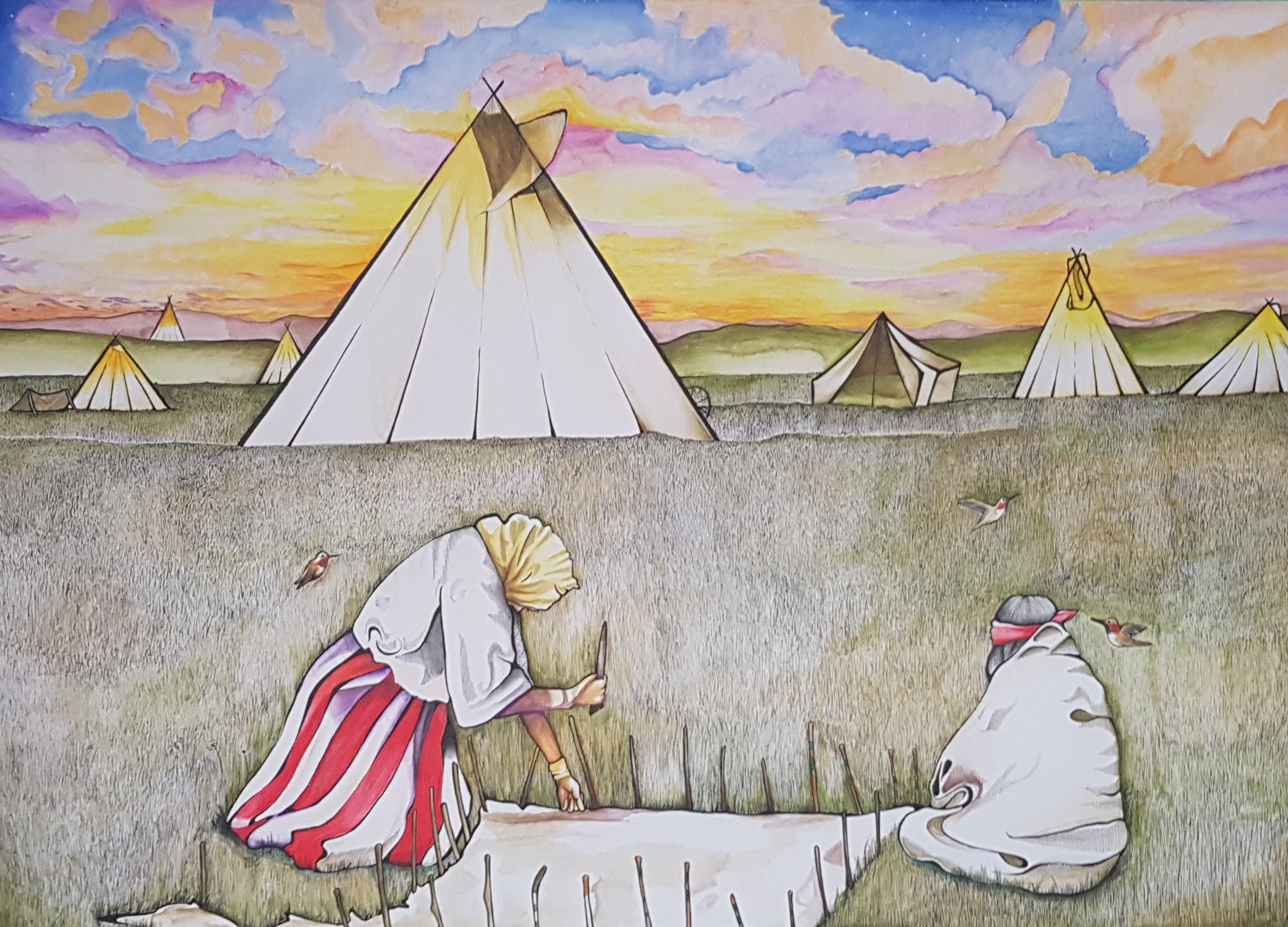 The goal of the Heritage Art Series is to use modern art and supporting images as portals to tell interesting stories about Alberta’s past. This hopefully in turn encourages respect and preservation. The image below was painted by Piikani artist Rebekah Brackett in 2018 as part of the series. Titled “This Woman’s Work”, the art depicts the toil, immense value and beauty of tanning hides on the prairies. Readers can explore more art-anchored stories here including tales of Alberta’s gold rush, an interwoven history of ammonites, an ancient flood that exposed the oil sands or a brief history of fishing in Alberta’s northern forests.