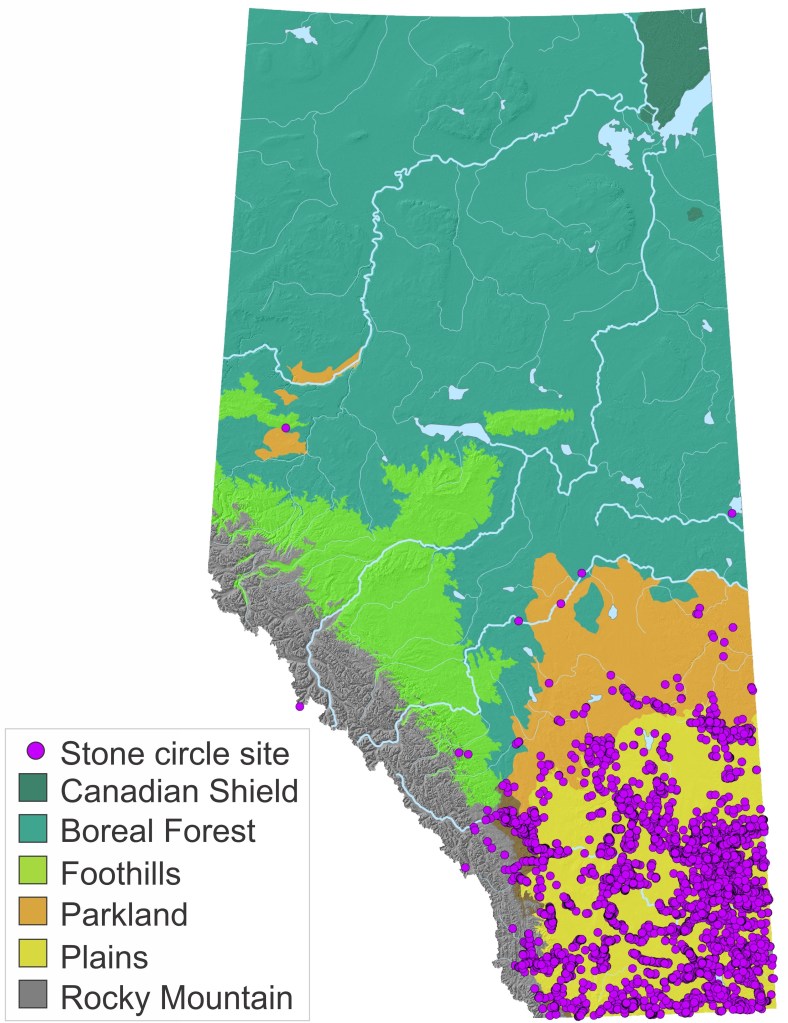 Small rings of rock appear across Alberta’s prairies. These stones once weighed down the bison hide covering of tipis – a type of dwelling used by generations of First Nations. Tipis, and the remnants of them, have drawn the attention of archaeologists and historians in the province for over 70 years. It is estimated that Alberta had a million stone circles before being displaced by farming and other developments. Currently, the province has over 8,000 recorded archaeological sites with tipi rings: some are a single circle (a small camp) while others host over 200 rings in one spot (a large gathering of family and allies). New figures and imagery here highlight decades of archaeological research and help visualize how records of tipi rings can reveal dimensions of pre-contact life.