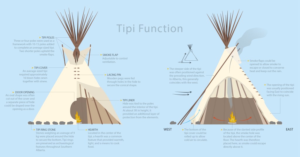A tipi is a hide or fabric cone supported by wood poles. At first glance, tipis look symmetrical but most are designed to be tilted towards the back. The steep side usually faces oncoming winds and the shallower, more sheltered side has a door opening and smoke hole. In Alberta, the door often faces East to the rising sun. Smoke from a central fire escapes directly upwards through a hole with adjustable flaps on either side: a characteristic feature of Plains tipis. In cold, windy places, like in Alberta, tipis often have an inner liner for extra warmth and are tethered by rope from the pole junction down to a central peg for added stability. Thankfully for archaeologists, many tipis were anchored by circles of stones around the perimeter. By measuring these round remnants, archaeologists can learn how many people likely lived at a site and what types of relationships they had with surrounding animals, both wild and domestic.
