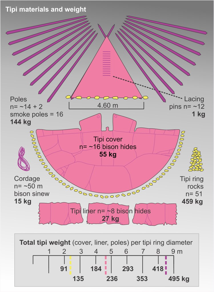 Tipi poles, covers, liners, cordage, and lacing pins had to be loaded and moved up to 30 times a year. Source: Todd Kristensen, 2024, based on work by Finnigan, 1982, and Brumley and Dau, 1988.