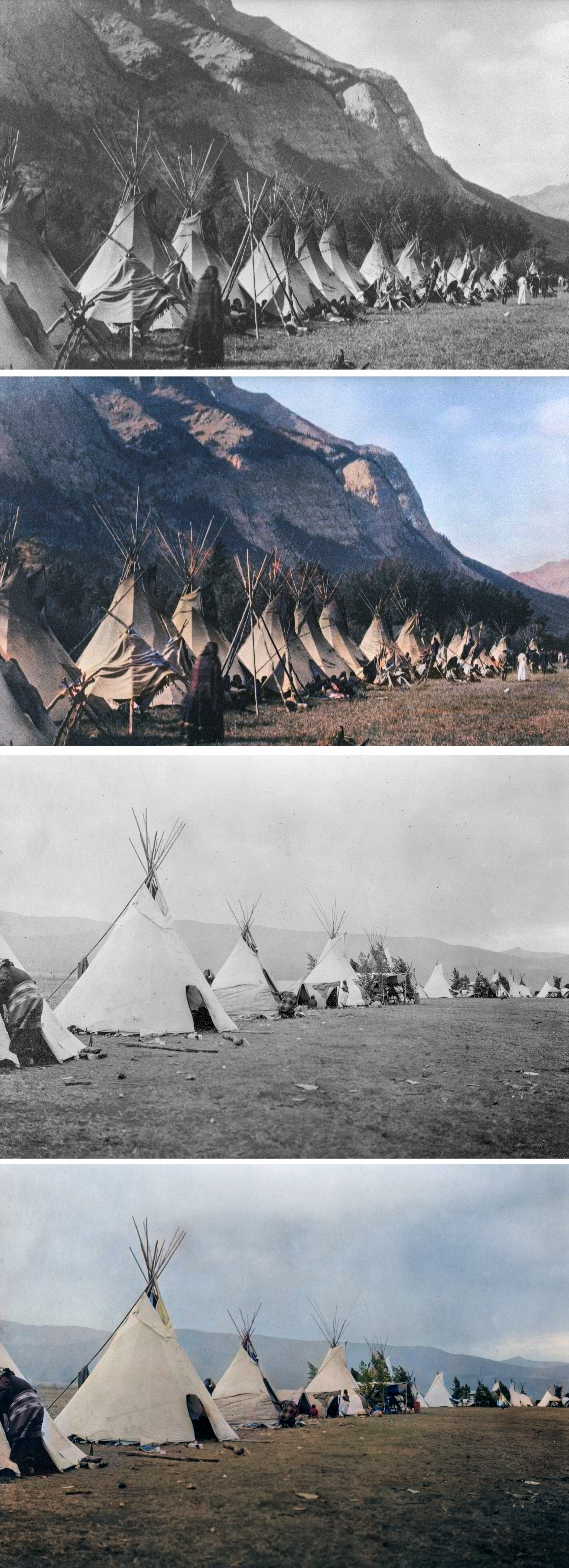 Lastly, historic photographs of tipi camps in Alberta have been colourized with photo-editing software to breathe life into them. Colourizing images helps humanize the past and alerts the eye to previously overlooked components of tipi life. This can include subtle but interesting aspects like the ages of tipi covers: new tipis are a clean, light brown while the tops of older ones are stained by smoke. On a larger scale, colour enlivens the past and reminds us that it was as dynamic as life today: it can help the viewer place themselves in a landscape to identify with the scene and its occupants. This is one of the principles that motivated the current tipi visualizations and a broader project called the Heritage Art Series.