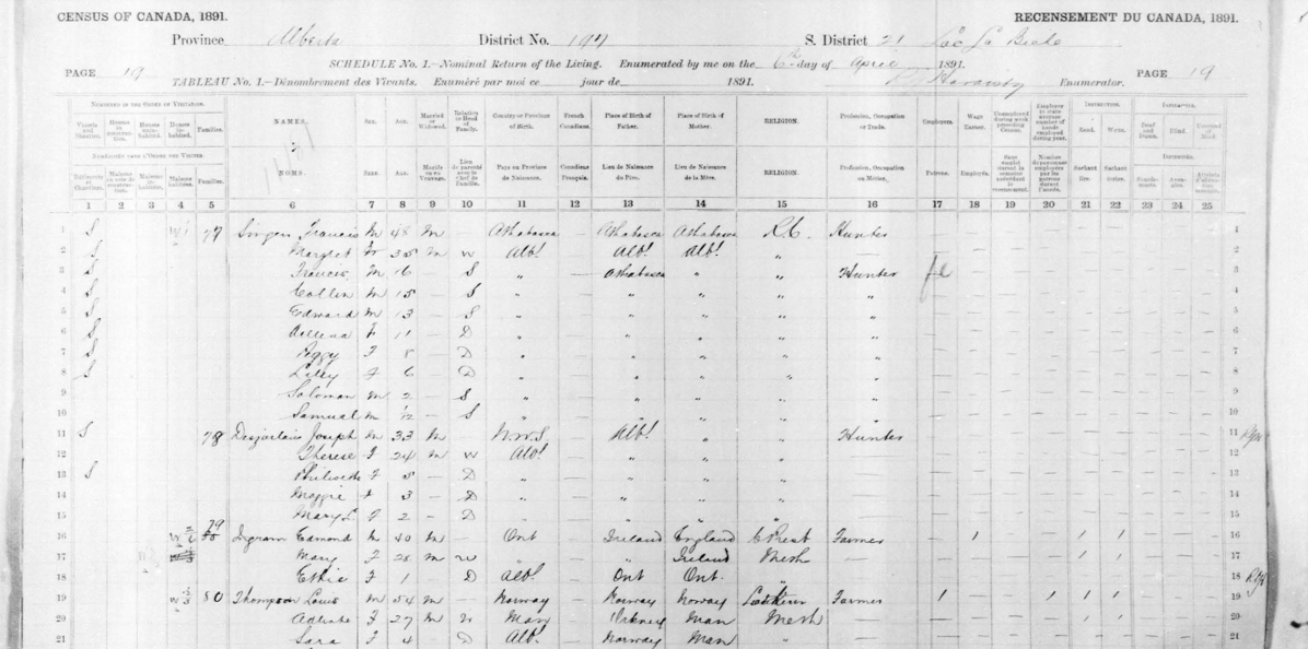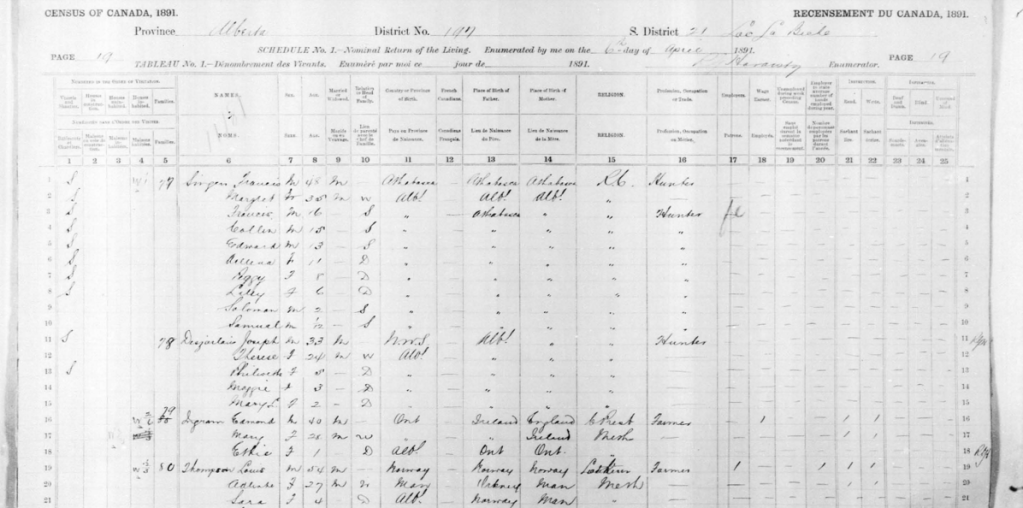 Victoria Settlement, northeast of Edmonton along the North Saskatchewan River, was settled in 1862 when George McDougall founded the Methodist mission on the site of a traditional Indigenous camping ground. Then in 1887, the area became known as Pakan after the name of the local post office, which in turn was named for Cree Chief Pakan (James Seenum). The settlement was abandoned in 1922 when the railroad bypassed the community, instead being built through the town of Smoky Lake, approximately 15 km to the north. The eras examined in the censuses are the periods of 1881-1911, as there is a national census every 10 years. In between the years of 1891 and 1901 a large Ukrainian population settled in the area, but my study focused on the Métis elements of the community.