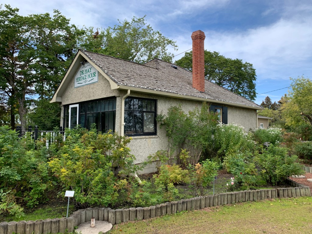 Dr. Andrew Hay was a prominent and beloved medical doctor in Trochu. Born in Medicine Hat in June 1914, he spent his teenage years in Stettler. He trained as a teacher at the Calgary Normal School and taught at a rural school near Gadsby. In 1936, he entered the medical school at the University of Alberta, where he convocated in 1942 and served overseas with the Canadian Army Medical Corps during the Second World War. He settled in Trochu in 1946 where he worked at the St. Mary’s Hospital and established a medical practice. He never owned a car or telephone, instead walking through town to make house calls and arranged rides to visit patients through the surrounding district. Dr. Hay died on May 30, 1973, and an estimated 700 people attended his funeral. He was also an avid gardener and naturalist. When the Alberta Heritage Survey documented the site in 1981, the house was seeing only occasionally use and was starting to fall into disrepair. However, even then, the Heritage Survey photographer noted that when in bloom, the gardens surrounding the house were truly beautiful. The house, now restored and surrounded by the Trochu Arboretum and Gardens, is a fitting memorial to this well-regarded and dedicated town doctor.