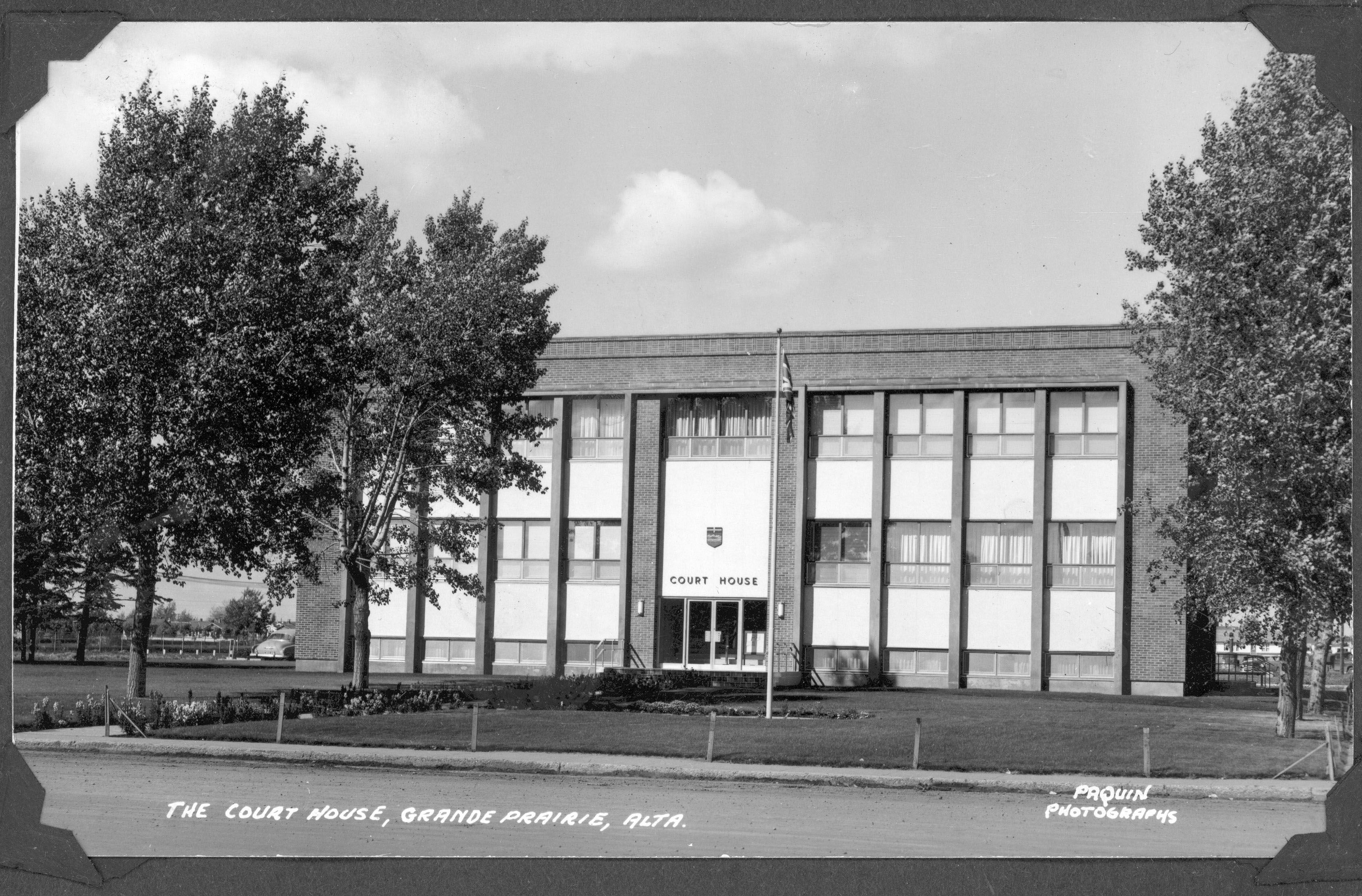Located at the corner of 99 Street and 101 Avenue in Grande Prairie, the Grande Prairie Courthouse is significant for its association with Alberta’s court system, as an example of public building architecture and as a local landmark. The courthouse was built in 1957 and served a district that stretched from Valleyview west to the Alberta-British Columbia boundary, and the Wapiti River in the south to the Peace River in the north. Population growth of Grande Prairie and the surrounding region meant that larger facilities were needed for the administration of justice.