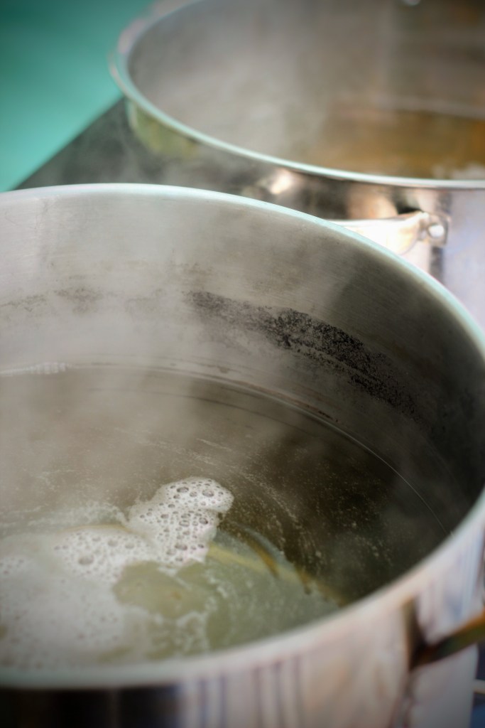 A propane stove and large pots are set up outside the band office. The waskwayâpoy is strained and set over low heat; too aggressive of a boil will cause all the water to evaporate. Unlike maple sap (with a ratio of approximately 40:1), birch sap contains considerably less sugar (approximately 120:1), meaning that more birch water is required to produce syrup.