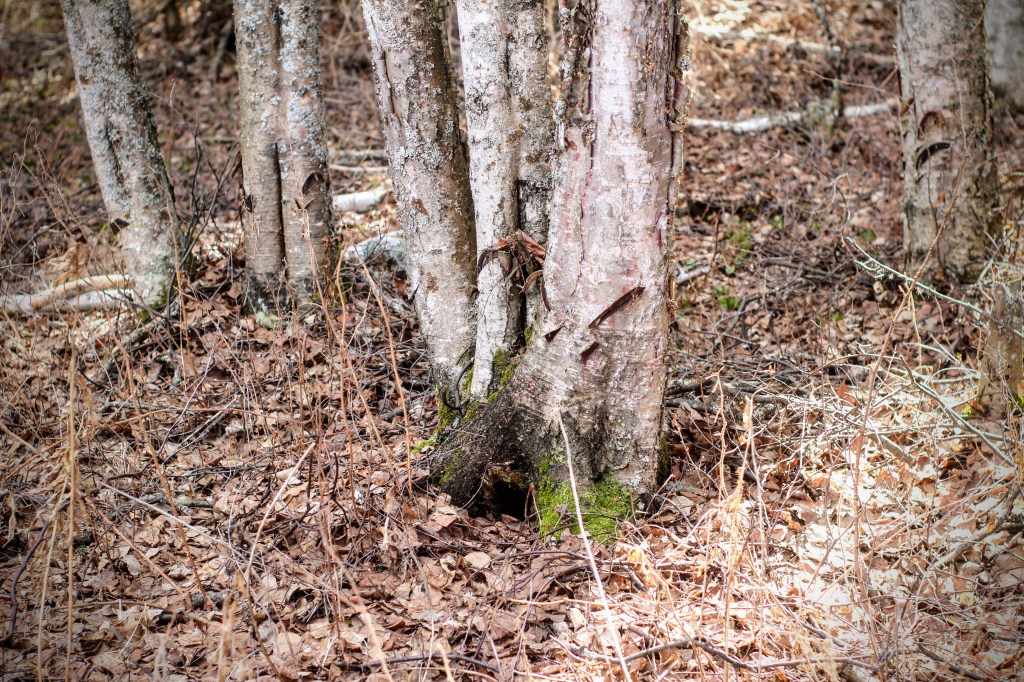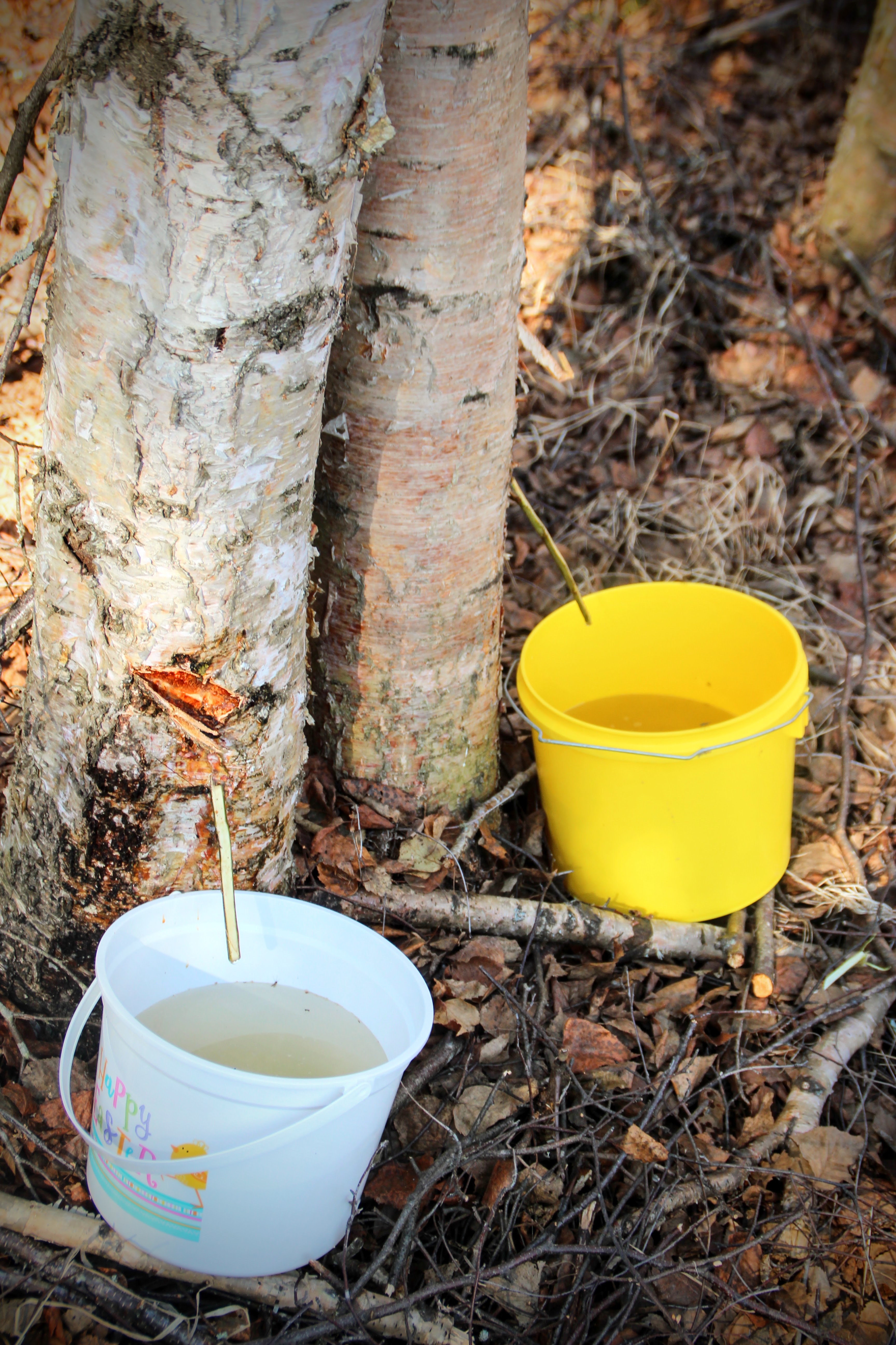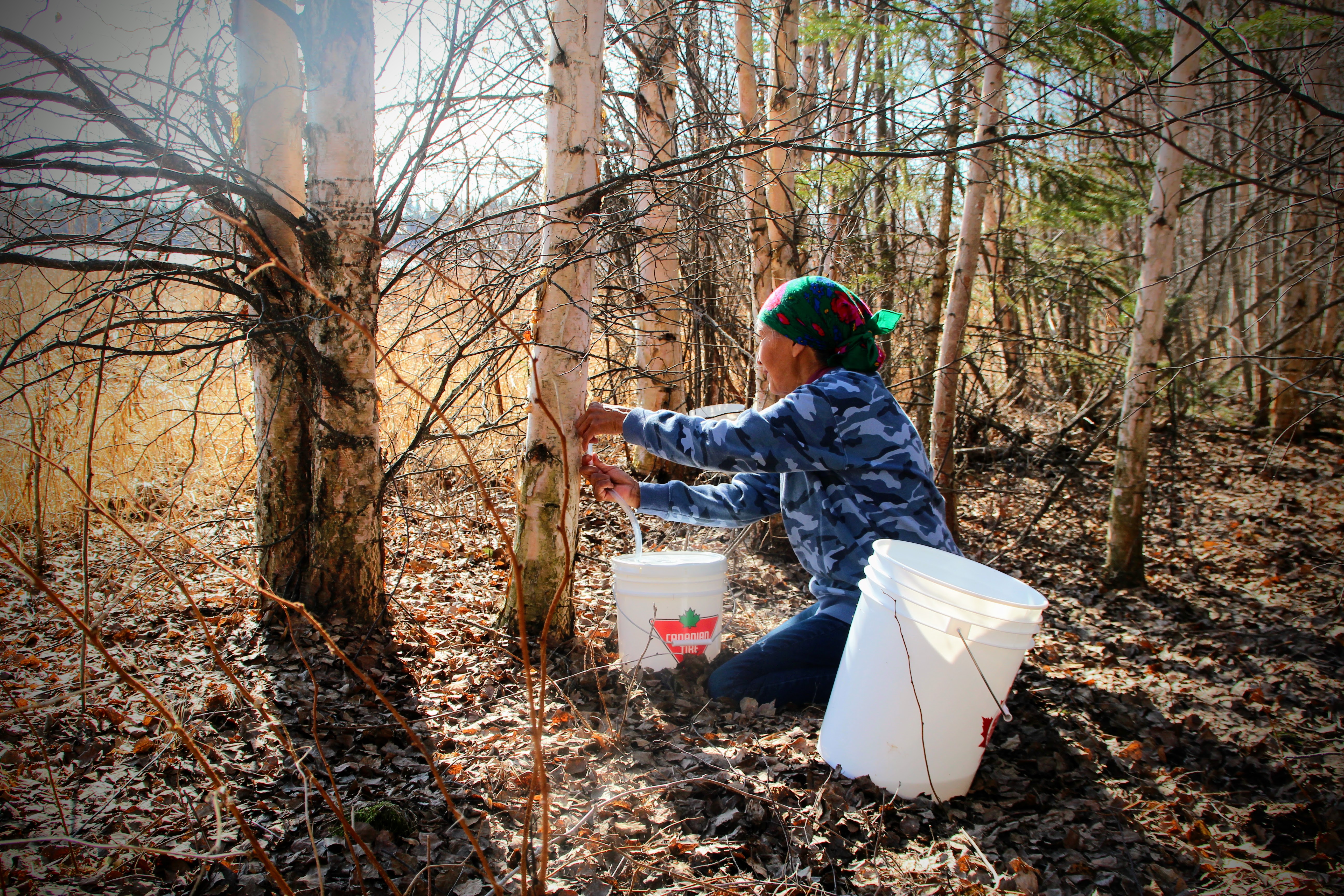 Nancy and her family use traditional methods to harvest the majority of the waskwayâpoy. A knife is used to cut a V-shape through the exterior, paper layers of the birch bark. Care is taken to not damage the internal cambium layers unnecessarily. A slender willow branch is stripped of its bark and a slit is cut on one end to attach to the V-shape, forming a lip and channel to direct the birch water into the bucket below. An axe is used to cut a small notch above the lip. In the spring when the sap is running, the cut instantly begins leaking birch water. Nancy kneels at the one tree that’s been the unfortunate victim of my first attempt (read: hack job), carving out a cleaner notch with her knife. She runs her finger from the cut down the truck, guiding the waskwayâpoy to the willow branch.