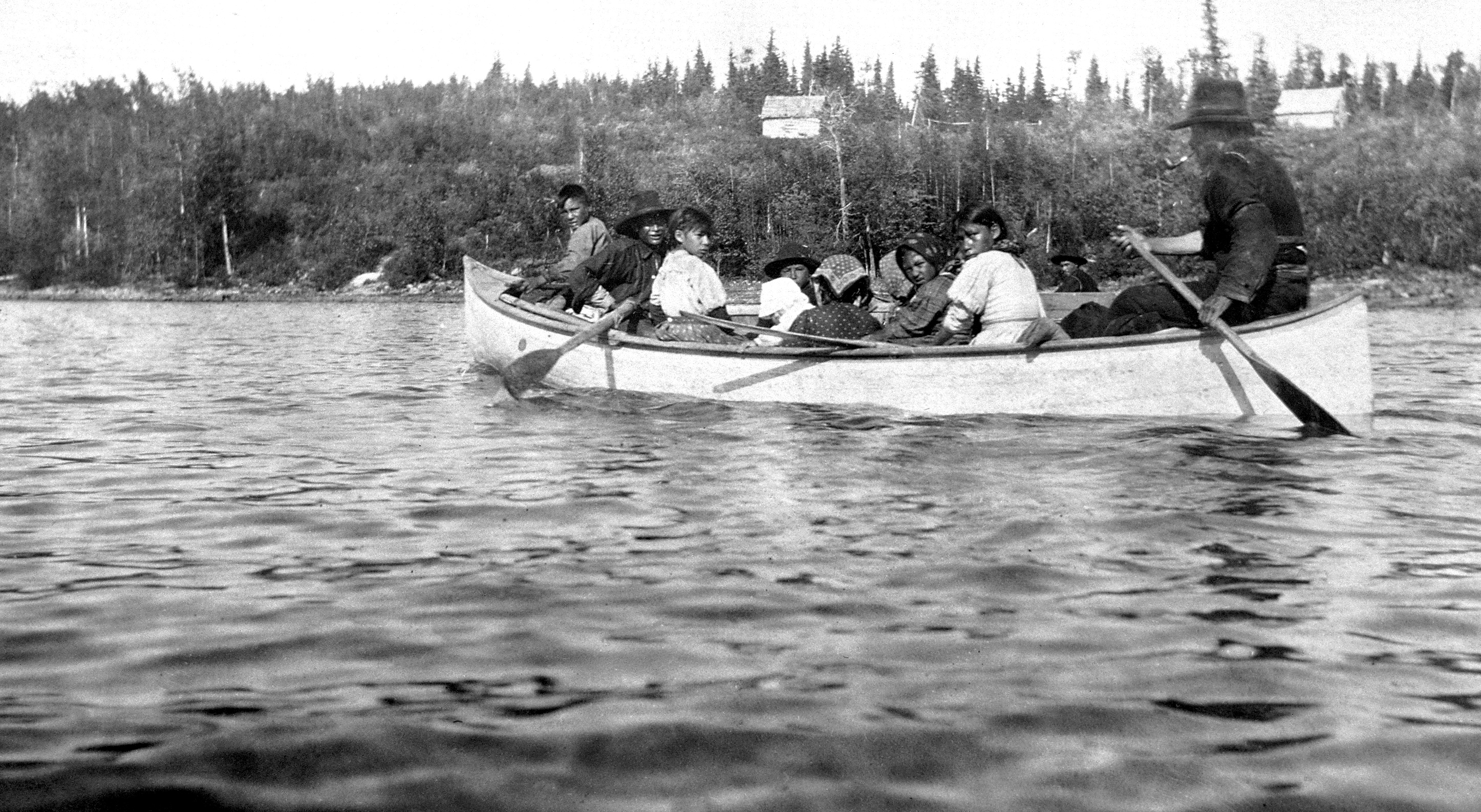 This landscape of rocky shorelines and many rivers, streams and lakes is remarkably far from Red Deer, Alberta. And yet, in October of 1900, eight children from Nelson House were taken from their home and admitted to the Red Deer Industrial School. They travelled the rivers, streams and lakes in one birch bark and one Peterborough canoe, watching the landscape become increasingly unfamiliar. First denied entry to Brandon Industrial School on account of their non-Treaty status, the children were then taken to Red Deer by missionary Samuel Gaudin.