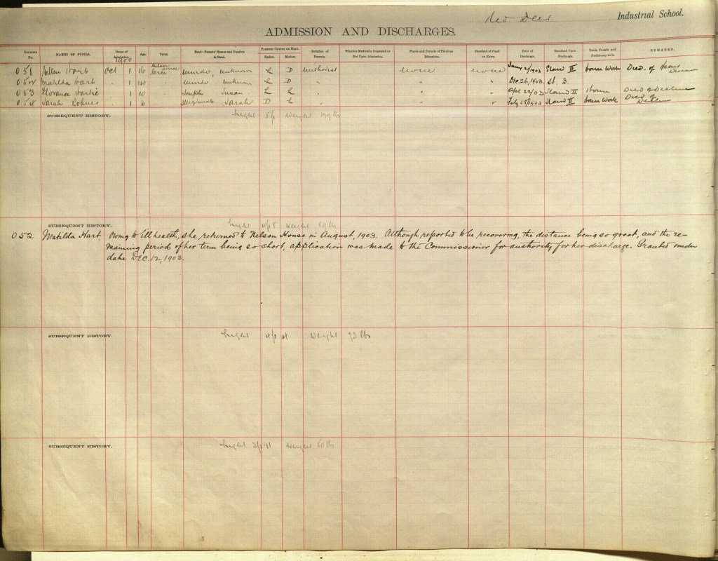 Ellen Hart was sixteen years old when she was admitted to Red Deer. She was Matilda’s older sister; both girls were assigned “housework” as their vocational trade in the industrial school. On January 20, 1903, Ellen died at school of reported heart disease. Her grave marker, made of wood, is one of four that remain today, and is on display at the Red Deer Museum and Archives.