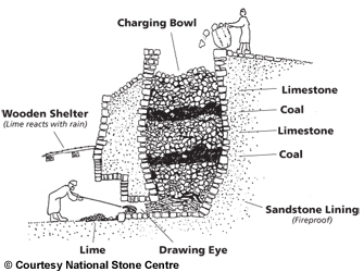 The kiln is built into a natural alcove in the limestone exposure, set on a rocky shelf at a height to protect it from the impacts of seasonal high water and ice scouring on the Slave River. It consists of a semi-circular convex stone wall extending from the bedrock which, together, create the chimney. The height of the wall extends to the height of the top of the bedrock. A stoke hole on the bottom of the wall faces toward the river. An interesting feature of this kiln is that one side of the wall of the kiln does not abut directly against the limestone outcrop. The collapsing wall on the down-river side appears to have been built mostly flush to the bedrock face. The wall on the up-river side, though, remains in its original condition showing it was built with a 30-60 cm gap between the edge of the stone wall and the bedrock face. It is not known what purpose this gap might have provided for the operation of the kiln, although, it is easily wide enough to allow for a person to enter the cavity of the chimney.