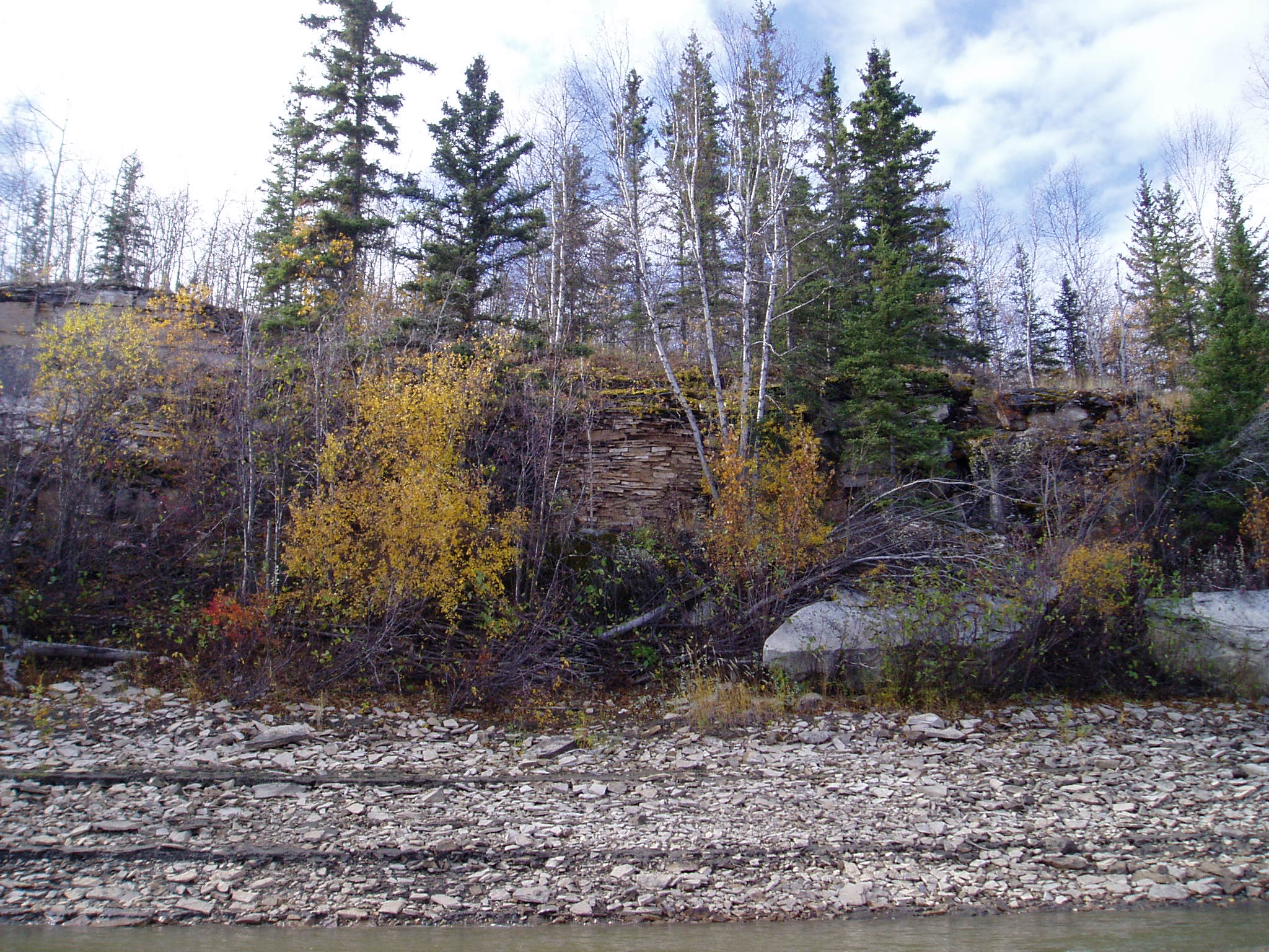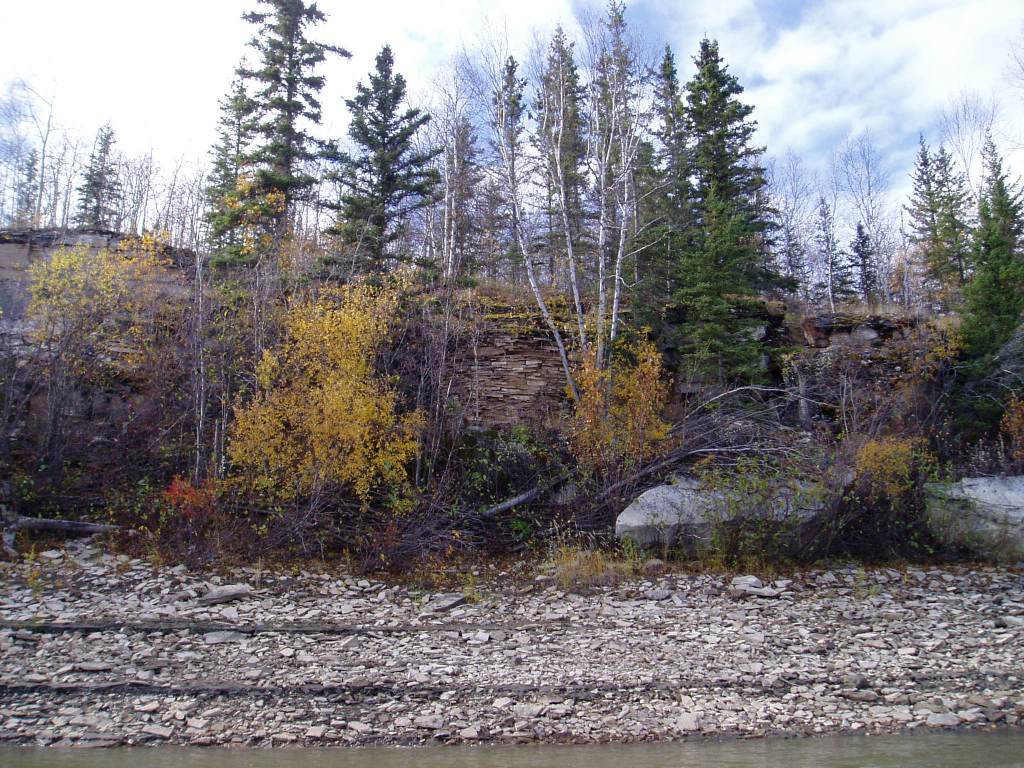About 50 km upriver on the Slave River from Fitzgerald, Alberta, among a small cluster of islands named Stony Islands, you will find the remains of a stone lime kiln. Archaeologist Marc Stevenson documented the kiln (IjOu-5) and a nearby quarry (IjOu-6) during a survey of the Slave River in 1980. He described the kiln as a, “large semicircular limestone feature 4m in height.” The quarry is an exposed face of limestone just upriver from the kiln. All that we know about the history of the kiln is based on notes from a conversation Stevenson had with a Brother Seaurault. According to Stevenson, “The feature, according to an elderly informant, is the limestone furnace used by residents of Fort Chipewyan in the 1910’s and 1920’s to make whitewash for their log homes in the latter settlement.” It appears, therefore, to have been here for at least a century and is now showing the degradations of time, seasonal flooding and ice scouring.