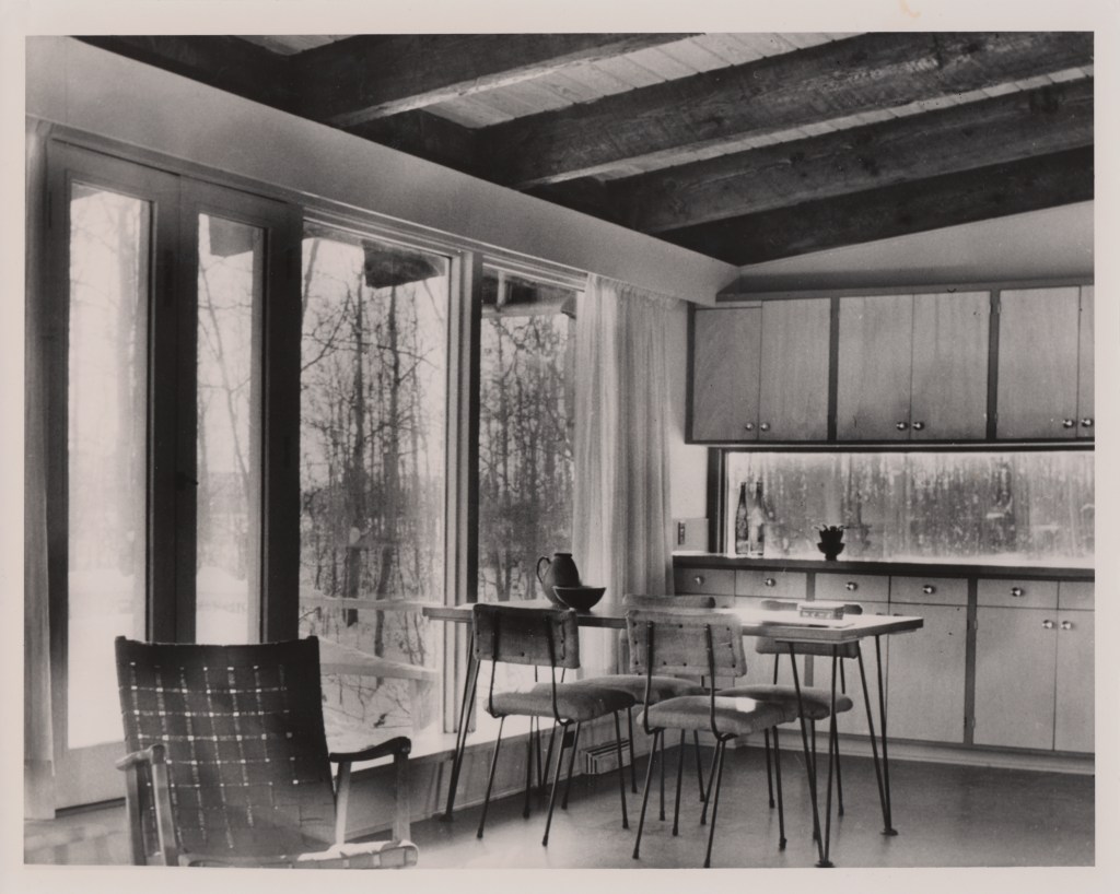 Traveling back upstairs, we come to the dining space and kitchen, which is defined by flexibility, simplicity and thoughtful design. The standout feature is the ‘dining end,’ which is a window nestled between the kitchen’s upper and lower cabinets, a signature feature often seen in other Wallbridge & Imrie projects. It demonstrates their knack for clever functional solutions. The compact, simple bent-metal dining furniture, likely of their own design, exemplifies the understated elegance of their modernist aesthetics and their desire for clean, open, light and simple designs.