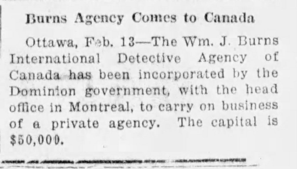 In 1919, J.E. Almond announces that he, as Principal, has opened an Edmonton branch of the International Detective Agency. Almond states in his July 1919 advertisement that, “our Quality of Service…is the best attainable in America”. This international reference suggests that Almond was seeking to associate his venture with the famous William J. Burns International Detective Agency established in 1909 in the USA. We don’t know if Almond’s detective business was a legitimate association with the Canadian organization headquartered in Montreal. Almond continued to advertise his International Detective Agency into the 1920s.