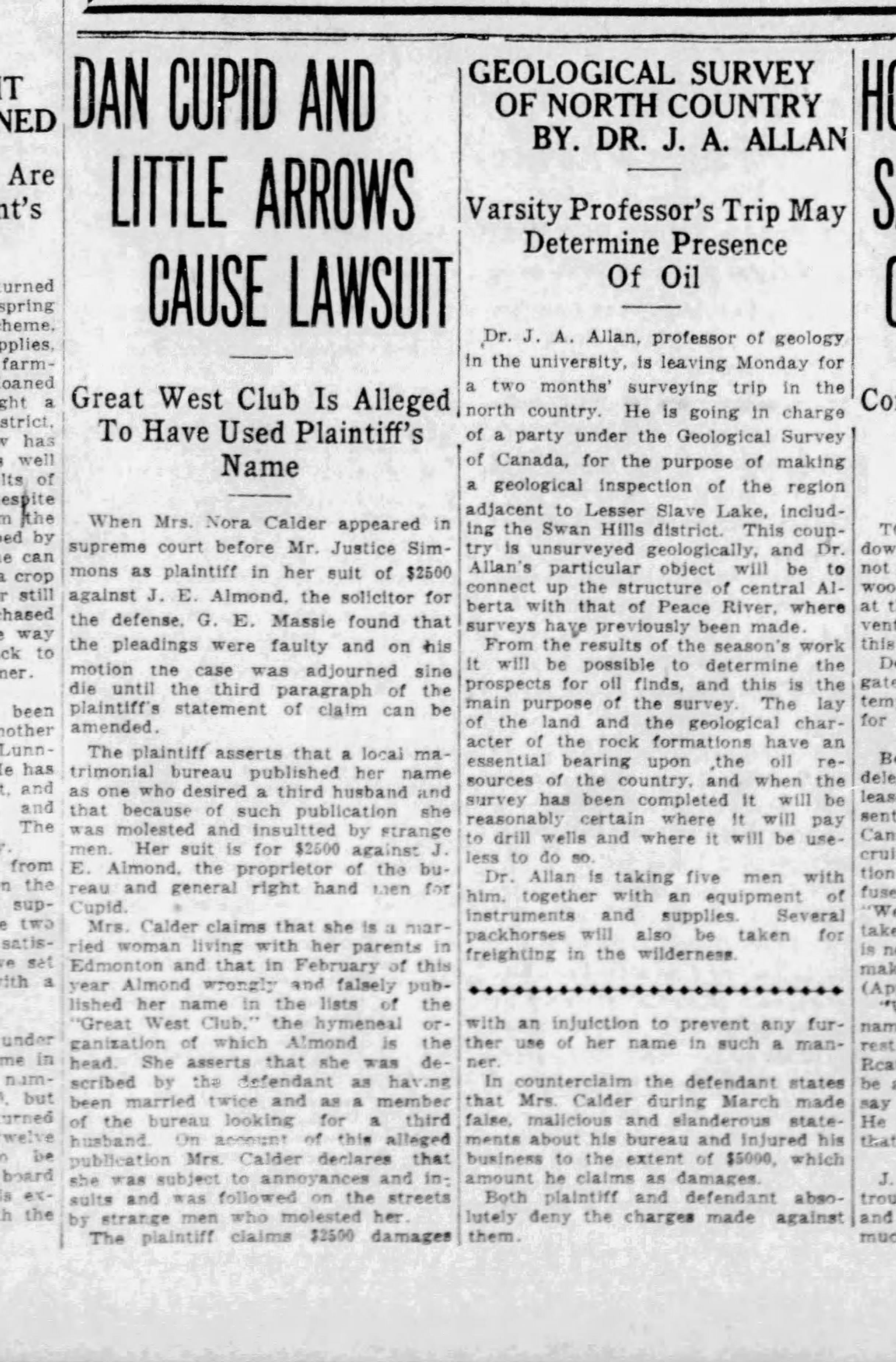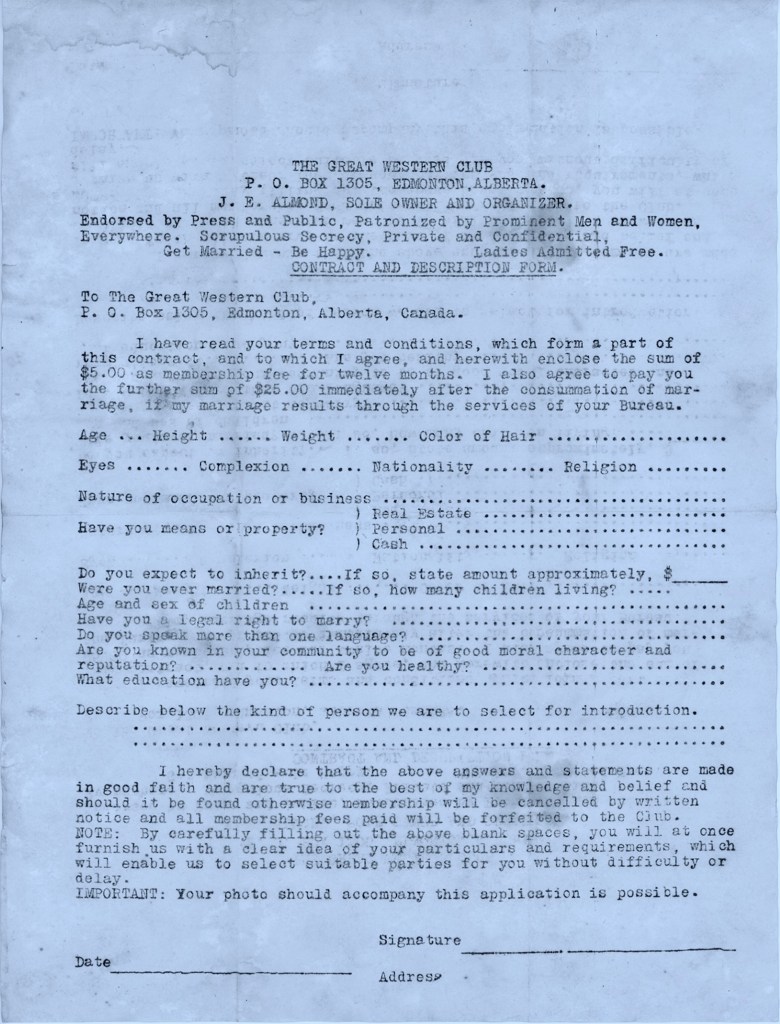 A search for the Great Western Club did not result in an announcement of its origins. The first Edmonton Journal reference is about a lawsuit initiated by Mrs. Nora Calder against J.E. Almond as published on June 8, 1918 in the Edmonton Journal. She claimed that The Great Western Club, despite its claims for scrupulous secrecy, published her name as one who desired a third husband and that she was, “molested and insulted by strange men.” She sued for $2,500 in damages. “Mrs. Calder claims that she is a married woman living with her parents in Edmonton and that in February of this year, Almond wrongly and falsely published her in the lists…In counterclaim, the defendant states that Mrs. Calder during March made false, malicious and slanderous statements about his bureau and injured his business to the extent of $5,000, which he claims as damages.” I was not able to find any follow-up of any the court settlements and claims against J.E. Almond.