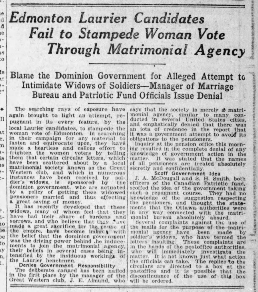 The story of the Great Western Club becomes even more intriguing when the Edmonton Journal reported on December 15, 1917 (the federal election was held that year 2 days later on December 17) an allegation by the local Laurier candidates (Liberal opposition in the federal government at the time was led by Wilfred Laurier) that the Dominion government under the leadership of Conservative Prime Minister Robert Borden, through The Great Western Club, were circulating letters to widows of WW1 soldier victims to get these widowed pensioners married and off the government payroll.