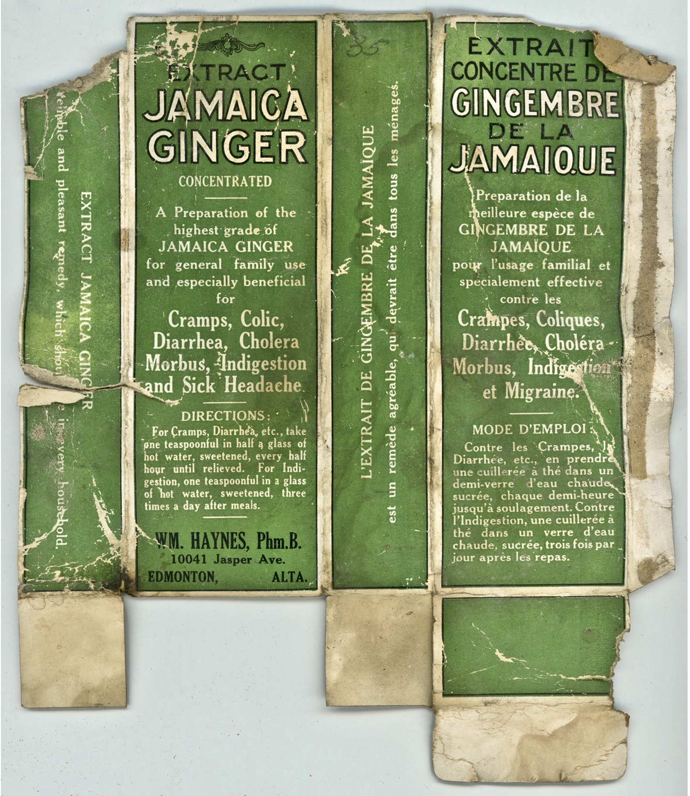 This item, found in the Pendennis Hotel, was packaging for Jamaica Ginger extract, prepared in Edmonton by the Wm. Haynes Pharmacy on Jasper Avenue. It was a late 19th-century patent medicine that provided a convenient way to obtain alcohol during the era of Prohibition, since it contained approximately 70 to 80 per cent ethanol by weight.