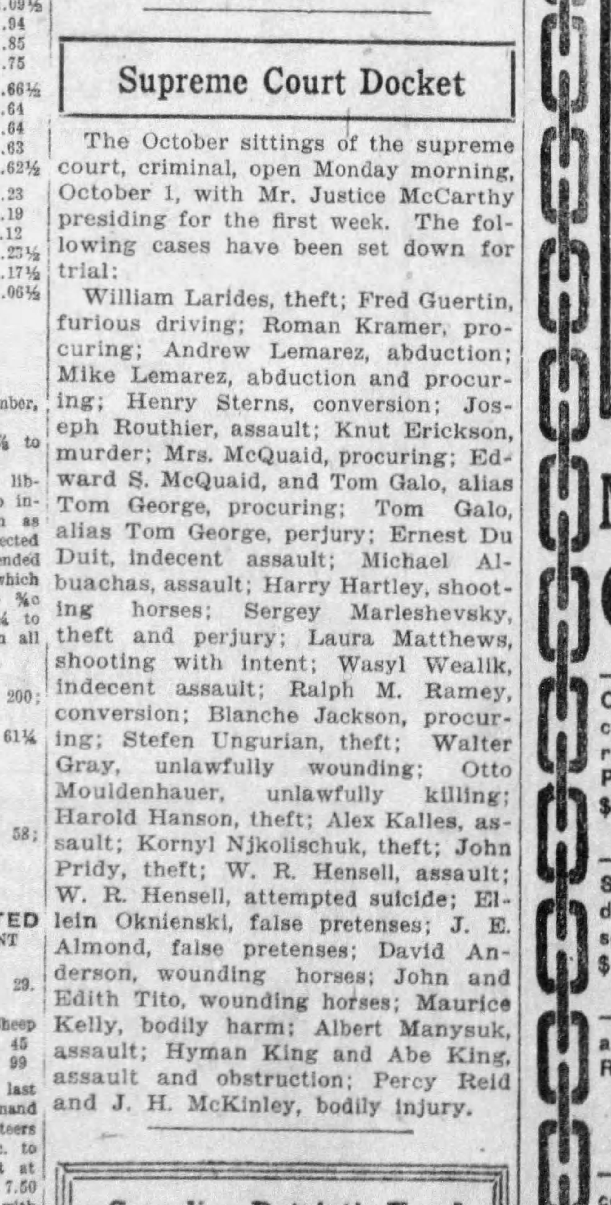 In September 1917, it is reported in the Edmonton Bulletin Supreme Court Docket that a case of, “false pretenses” against J. E. Almond was set for trial. There are no details of this case.