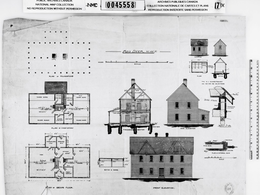 The scale of the Calgary building became standard for immigration halls built up until 1908, though the plans became more sophisticated as early as the 1890s. As we see in the full Department of Public Works drawing package for the (unbuilt) Red Deer immigration hall, changes include the central entrance that provides symmetry and order to both the plan and the elevation. The plans are now more thought-through, with a central chimney core around which radiate the agent’s office, kitchen and segregated common rooms; upstairs are a combination of dorms and family rooms. In 1904, Edmonton and Medicine Hat received more fancy versions of this design, with the symmetry of the façade emphasized by a raised entrance, classical pediment and flanking dormers and decorative finials. These fancier halls also included a basement with deep bathtubs, laundry facilities and a furnace for central heating.
