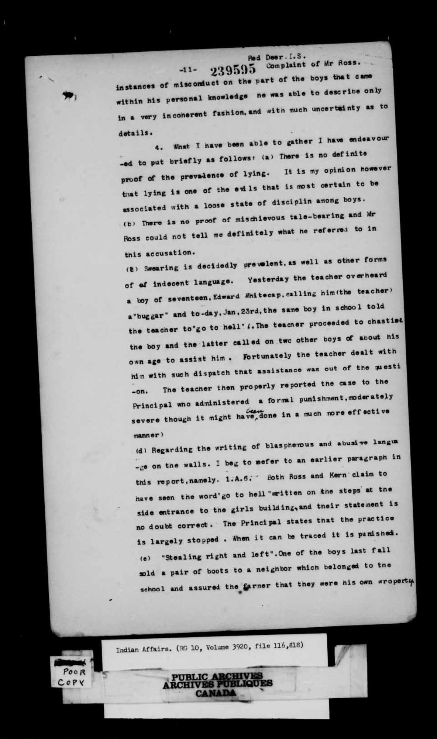 Yesterday the teacher overheard a boy of seventeen, Edward Whitecap, calling him (the teacher) a “bugger” and today, January 23, the same boy in school told the teacher to “go to hell.” The teacher proceeded to chastise the boy and the latter called on two other boys of about his own age to assist him. Fortunately the teacher dealt with him with such a dispatch that assistance was out of the question. The teacher then properly reported the case to the Principal who administered a formal punishment, moderately severe though it might have been done in a much more effective manner.