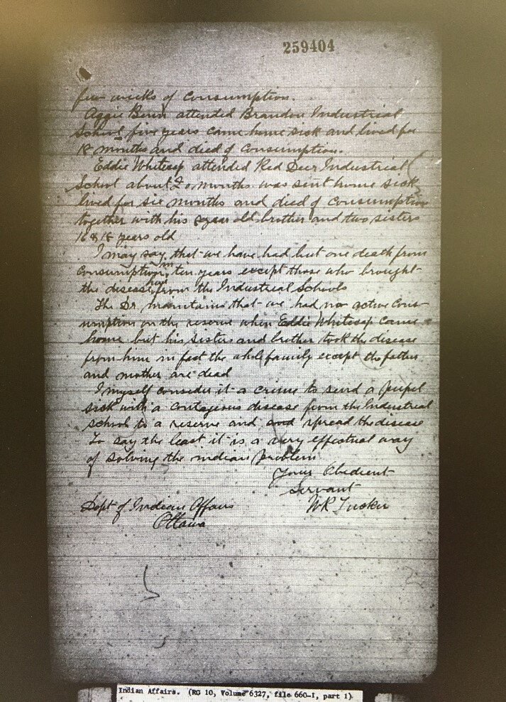 …The doctor maintains that we had no active consumption on the reserve when Eddie Whitecap came home but his sisters and brother took the disease from him; in fact the whole family except for the father and mother are dead.