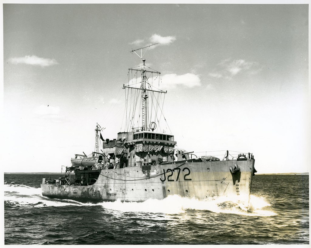 HMCS Esquimalt was a Bangor-class minesweeper operating out of the port of Halifax to hunt enemy submarines and keep approaches to the harbour clear of mines. Named for the Township of Esquimalt on Vancouver Island, she was launched in 1941 and was originally assigned to patrol duties off Newfoundland and was transferred to Halifax in September 1944. On 15 April 1945, Esquimalt sailed on a patrol to hunt a German U-boat that was suspected to be in the waters near Halifax. At approximately 6:30 a.m. on the morning of April 16, with the lights of Halifax visible on the horizon, a torpedo from German U-boat U-190 struck Esquimalt on its starboard, flooding the engine room and causing a loss of power. In less than five minutes, and before a distress call could be sent, Esquimalt rolled onto her starboard side and sank beneath the surface.