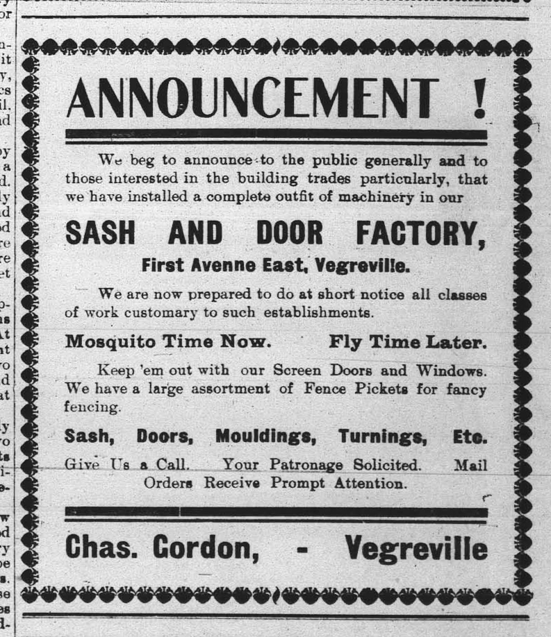 “Gordon’s Sash and Door Factory.” Vegreville Observer [Vegreville, AB.], Volume V, No. 29, 19 Oct. 1910, p. 1. University of Calgary, Calgary, Alberta. Canada., Libraries and Cultural Resources Digital Collections, Early Alberta Newspapers Collection, (CU12487927), from microfilm reel 319, Image 319 (1910-10-19), https://digitalcollections.ucalgary.ca/asset-management/2R3BF1O0RFYQO.