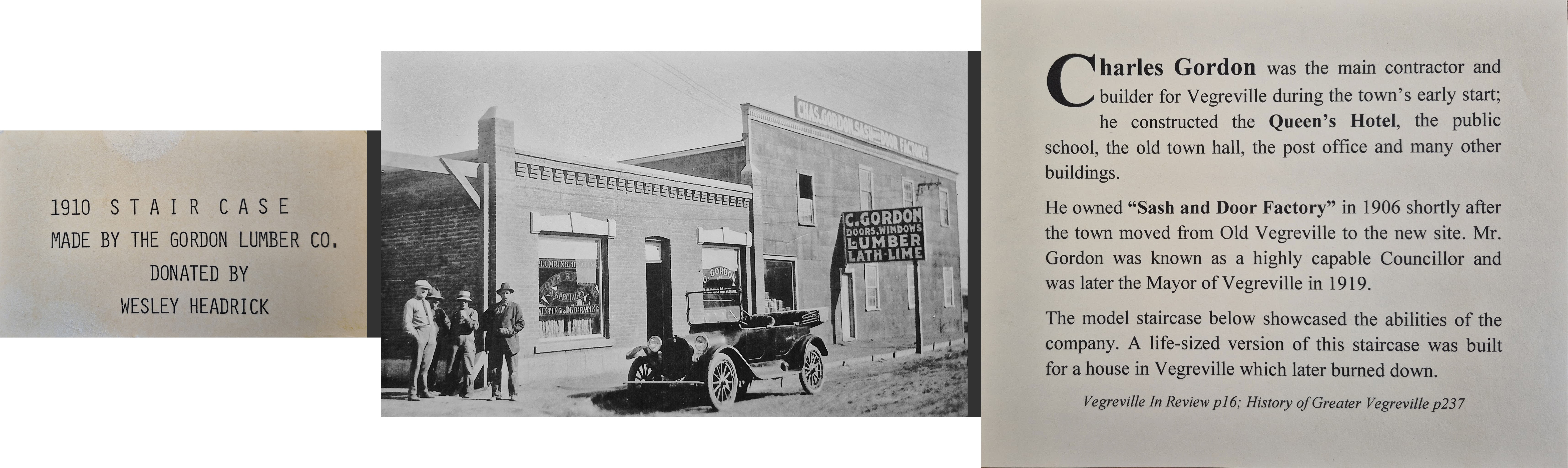 The last item was a brief description providing more context about the factory and its owner, Charles Gordon, described as, “the main contractor and builder for Vegreville during the town’s early start.” Gordon was credited with constructing several of the town’s most notable early buildings and later served as Vegreville’s mayor for a number of years. The statement also noted that, “the model staircase below showcased the abilities of the company,” explaining that a full-scale version had once been built for a local home that was later lost to fire.