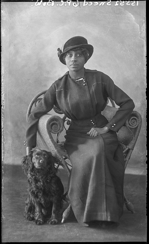 This portrait of an unidentified Black woman is typical of the images found among Brown’s portrait work. Featured in a previous Black history month post, there are few clues as to this individual’s identity except for the notes at the top of the negative, which read “15552 Sneed 6 P.C. B&W.” These administrative details used to track the negative provide the single clue, the name Sneed, that ties this photograph to a woman connected to the earliest Black families to settle in Alberta.