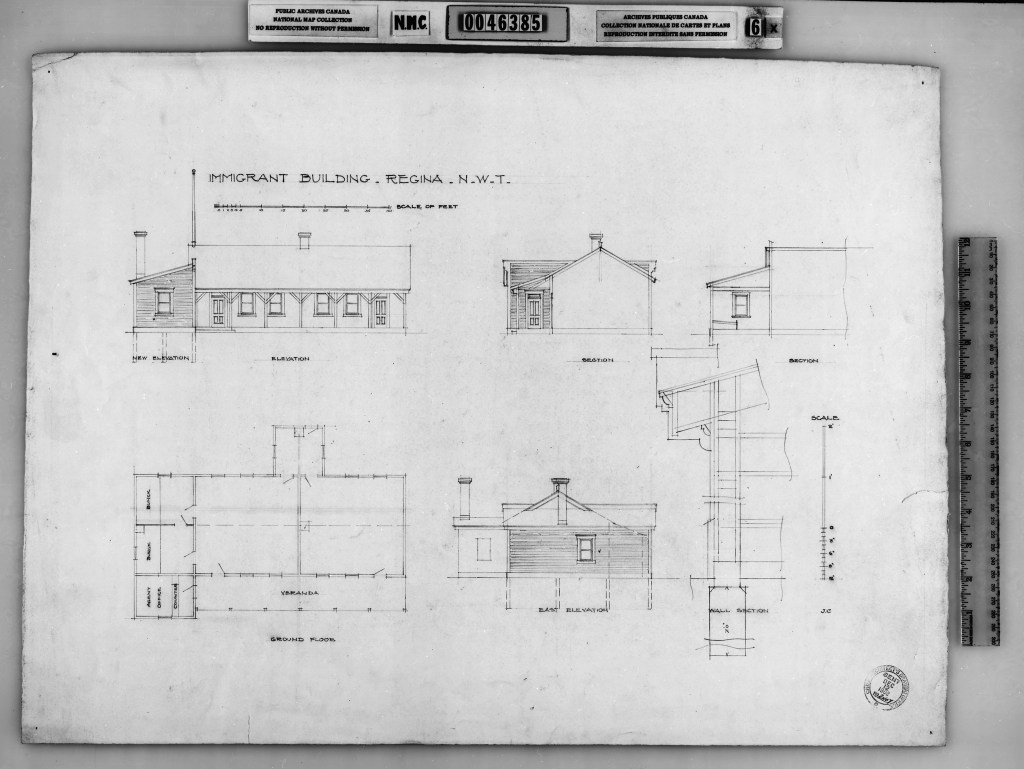 The first immigration hall there was erected the following year, just north of the terminus. Modeled on Regina’s first hall—designed by Canada’s Department of Public Works (DPW) and built two years earlier—this wood-frame Strathcona building had a single storey, two rooms sharing a wood stove, a kitchen bump-out at the back and an ell with rooms for luggage storage and a resident caretaker. A veranda stretched across the front of the building, with entrances at either end. As the government was concerned with sex segregation on the frontier, the two rooms of this small building did not have an interior connection.