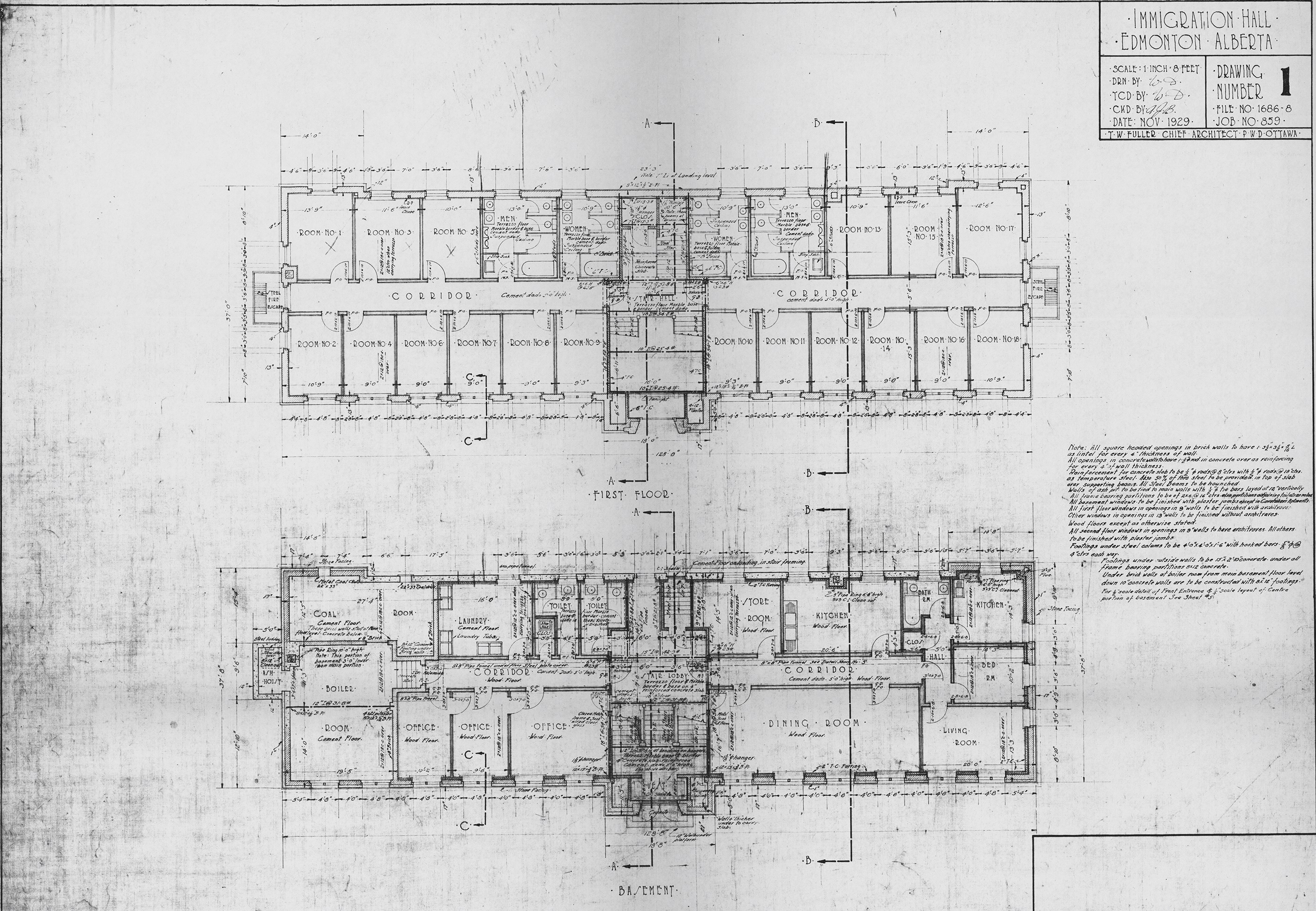 Immigration picked up again in the second half of that decade, particularly with the Railways Agreement which brought single farm, industrial and domestic labourers in great numbers. This led to the new construction of a few immigration halls in major distribution points, specifically Prince Albert, North Battleford and Edmonton. The country had developed, and the DPW had matured, so it was no longer specifying wooden sheds without architectural pretense. No, these three cities would receive proper brick and masonry government buildings with carved details and all modern conveniences. Prince Albert’s came first in 1927-28—it was, after all, the Prime Minister’s riding. Edmonton’s was the third of these three buildings. As its timing bumped up against the Great Depression and other factors, Ottawa nearly pulled the plug on the project; even immigration officials questioned the need for a new immigration hall. Nevertheless, construction proceeded with the building’s completion in late 1930. It hardly ever accommodated immigrants.