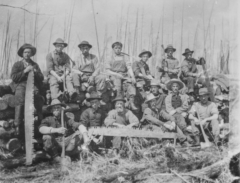 A logging camp (the Jackpine Wood Camp on Little Slave River in 1909) with men and their tools. Image A2532 courtesy of the Provincial Archives of Alberta.