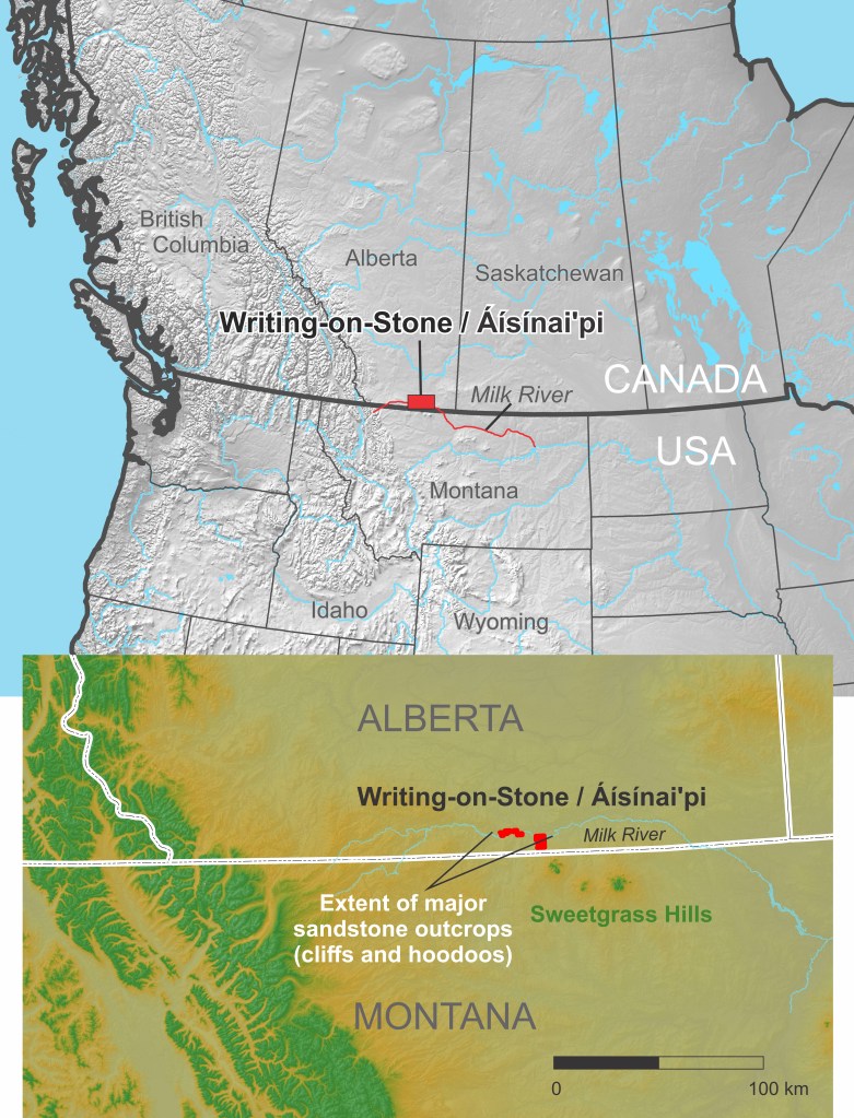 A muddy ribbon of water flows through southern Alberta on its way to the Missouri. Along the Milk River lies 3,000 years of beliefs etched and painted as rock art on sandstone walls. An 18 km stretch of the river meanders through 149 archaeological sites displaying several thousand individual rock art images. The art documents millennia of spiritual connections to a sacred landscape and centuries of cultural change during European settlement on the Great Plains.
