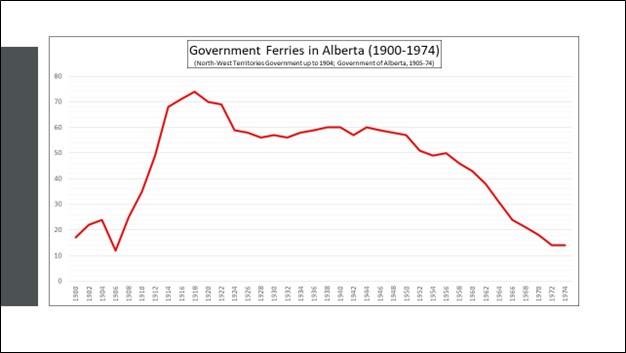 The number of ferries skyrocketed after 1906 with the explosive growth of Alberta’s population, which more than tripled from 1906 (185,412) to 1921 (588,454). With this growth in settlement came persistent demands from around the province for bridges across the province’s many rivers. The Department of Public Works responded by stating “it is impossible, with the funds at our command, to construct all large bridges required” and that the department would instead increase the number of ferries “as a first means of meeting the requirements.” As a result, the number of ferries operating in Alberta skyrocketed from 12 in 1906 to a high of 74 in 1918.