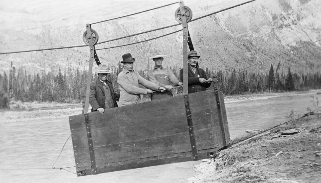 Water transportation has long played an important role in Alberta’s history. Long before the arrival of the first Europeans, Indigenous people travelled Alberta’s many rivers in canoes and crossed the rivers in ‘bull boats,’ small, round crafts made by stretching buffalo hides over a wood frame. European fur traders adapted these technologies for their own use starting in the late eighteenth century, while other strategies were developed to cross rivers, including small row boats (for passengers) and removing the wheels off Red River carts and floating cargo across on the flat bed. The arrival of agricultural settlement in the 1870s created much greater demand for safe and reliable river crossings – out of this demand emerged Alberta’s ferry system, which evolved from a small number of private operators to a sophisticated network of ferries across the entire province.